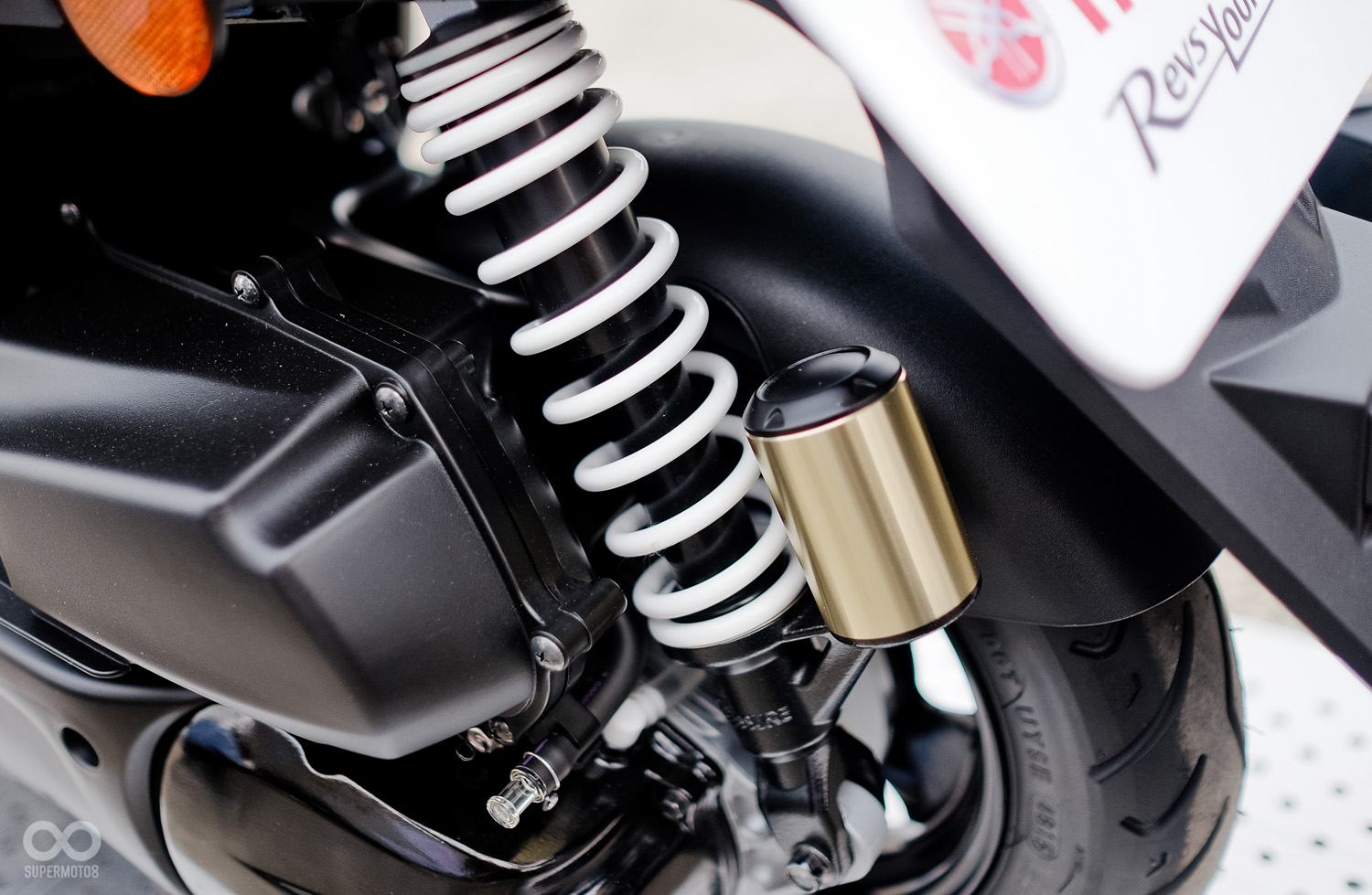 A:車輛的協調性是YAMAHA最重視的,JOG FS 上雖以單槍設計,在舒適與安定性已經足夠滿足顧客需求。在綜合車身布局、車重與置物空間等....後,搭配外置氮氣的單槍避震是最佳選擇。