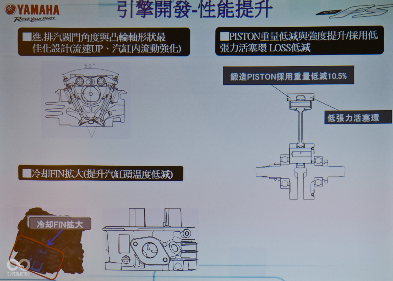 動力輸出上YAMAHA透過改變凸輪角度、減少活塞重量、增加缸頭散熱效果和提升傳遞效率,使JOG FS在性能表現上比起RS ZERO高出23%以上。