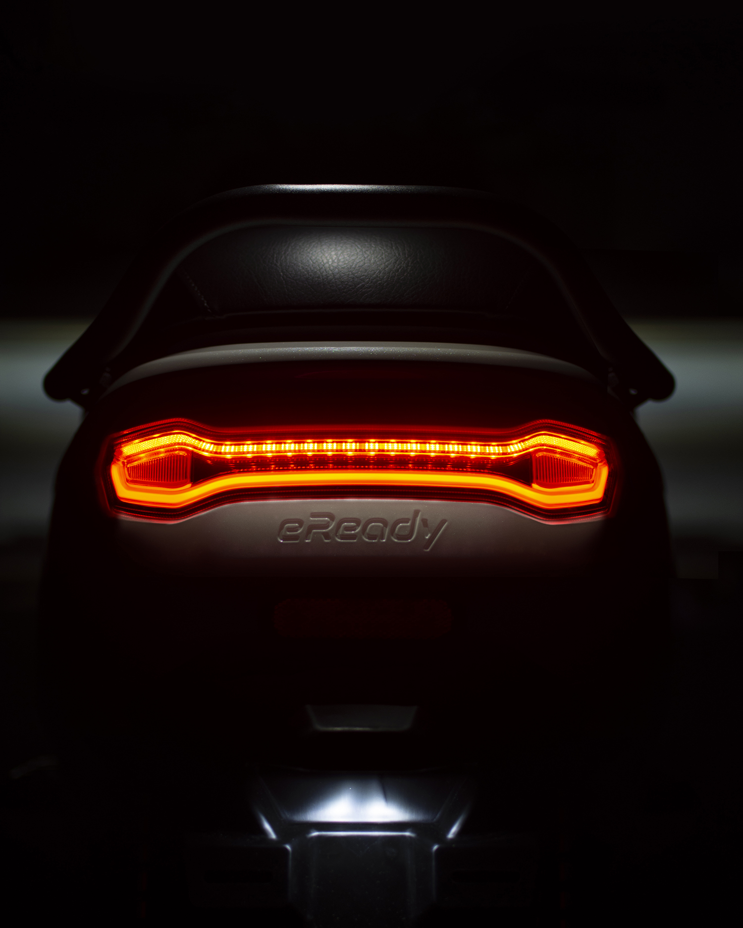 因此不僅機車相當重視尾燈設計,目前豪華轎車及超跑市場更將科技感、未來感、流線設計與品牌家族識別,融入於尾燈造型。因此eReady在尾燈設計上,除了採用與頂級豪華轎車同等級的極線式尾燈設計,上下兩條LED燈條更點綴出時下年輕人喜愛的星辰式尾燈輪廓,並且將煞車燈整合在上半部中央,整體BOWTIE領結狀的效果顯現出智慧雙輪的時尚感,至於方向燈則是設置在兩側立體的空間中,以不同的燈型與反射面來增加視覺張力同時提高安全識別度。