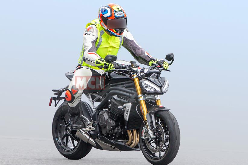 從間諜照看來,改款後的Speed Triple除了有和小弟Street Triple有著相同的家族化外型設計之外,在懸吊、煞車和車架部份也有小小的修改與提升,在懸吊部分可以看到Öhlins的金筷子前叉,同時煞車也採用Brembo Stylema的頂級卡鉗,從這兩項配備推測,這次被捕捉到的測試車很可能是性能更強的RS版本。