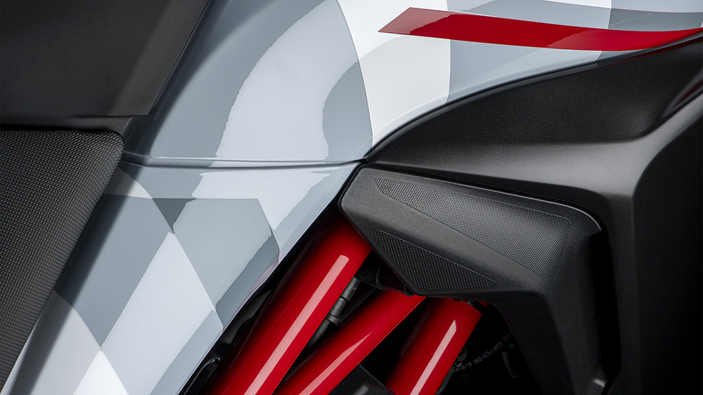 不論你是原廠標配的鍛造框版本還是選配升級的鋼絲框版本,明年開始都可以擁有GP白的全新配色。整台車的配色除了新增了白色之外,還保留了黑色和Ducati經典的紅色。這樣的配色讓你不論是在一般道路騎乘或是泥巴路探險,都可以保持著帥氣的白馬王子風格。
