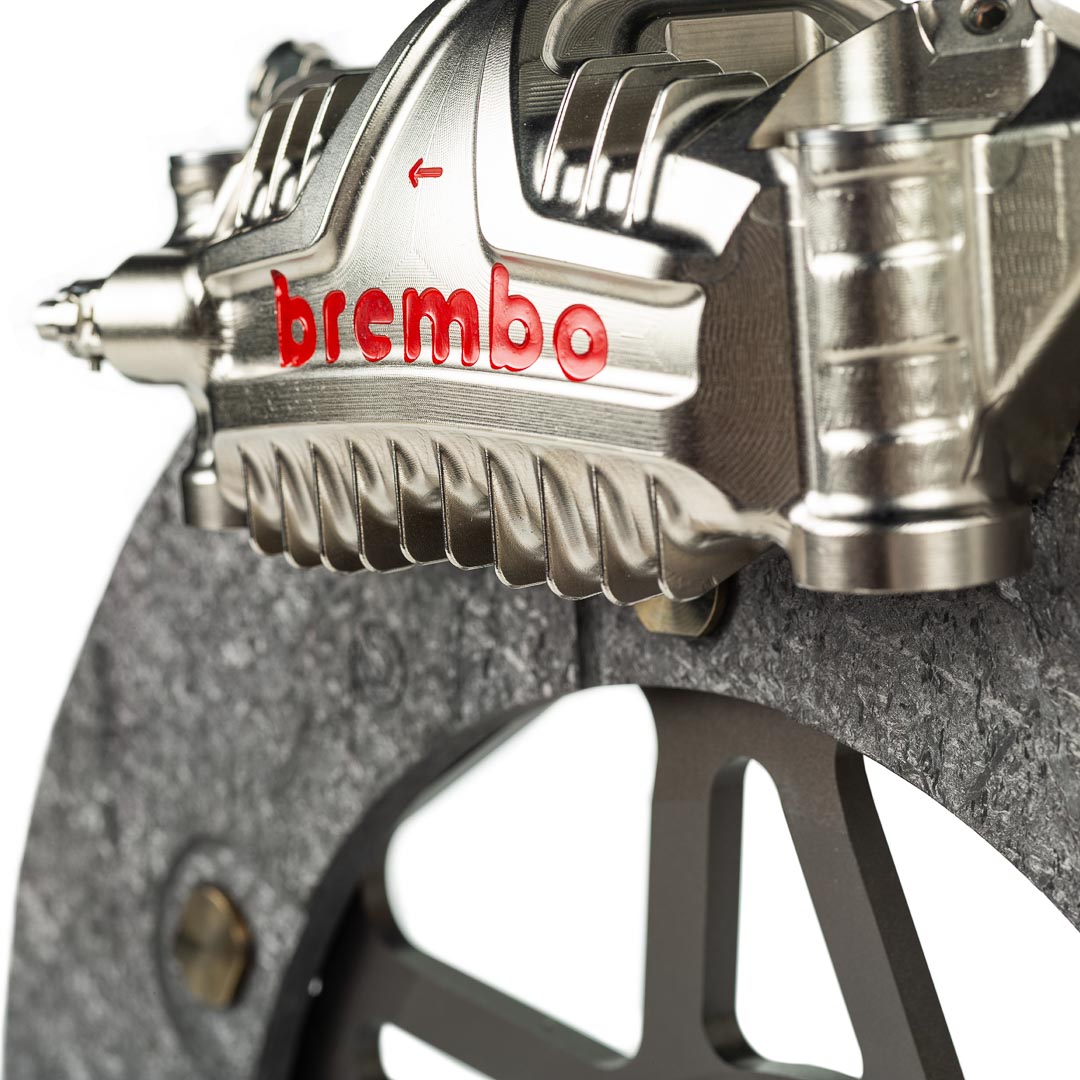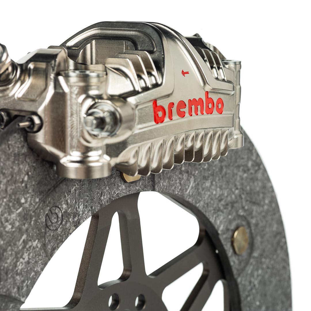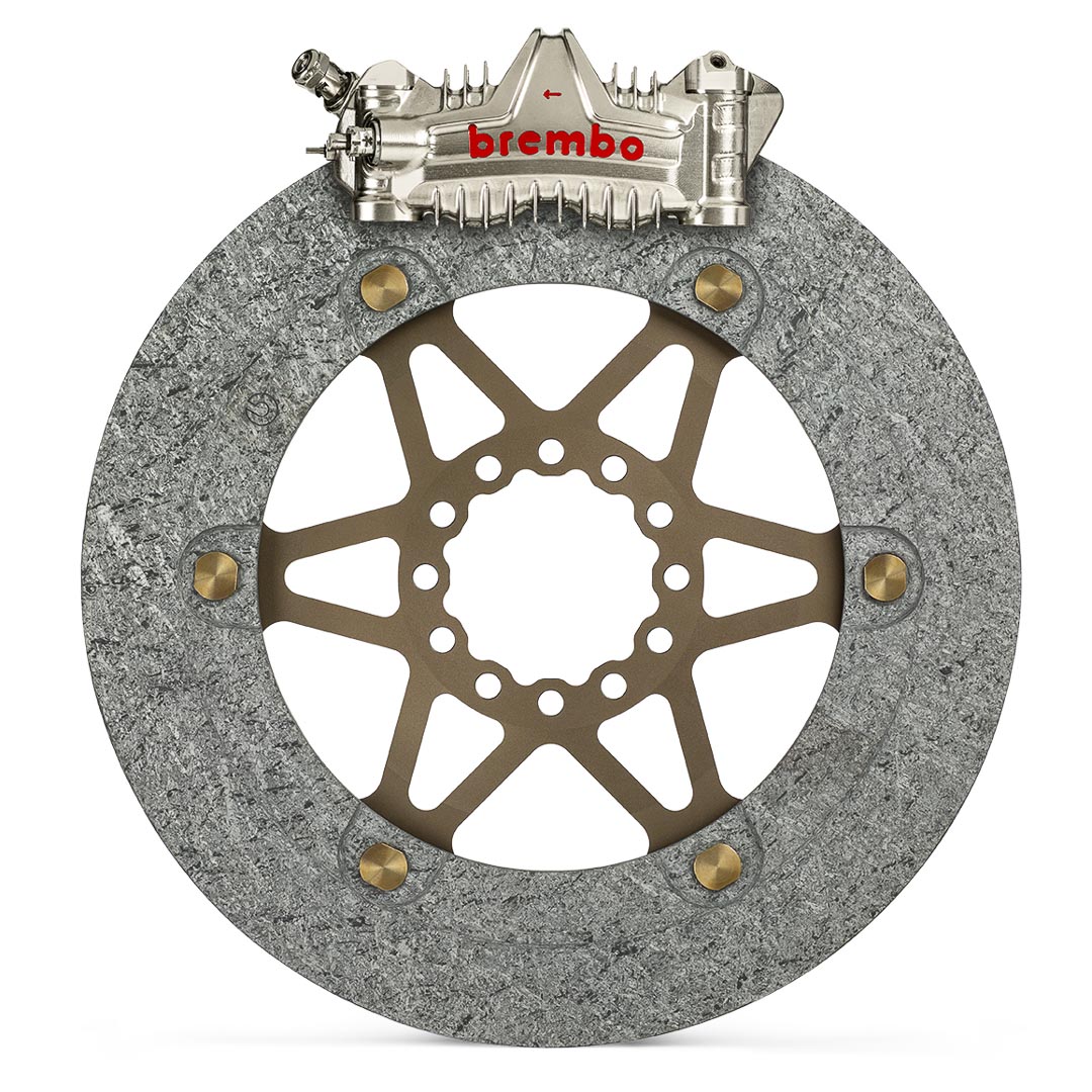 2020賽季中,Brembo提供320mm到340mm間,共四種尺寸的碳纖維碟盤供車手挑選,每種煞車碟盤都提供高密度、低密度兩種配方。碳纖維碟盤可減少懸吊系統負擔,並在比賽期間提供前後一致的煞車力道,以及免於鋼製碟盤的扭轉形變問題。