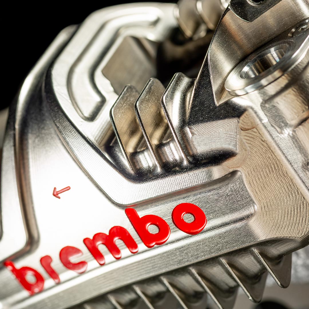 為了因為日益更新的賽車性能,俗話說跑得快也要煞得住,全新的Brembo GP4卡鉗經過開季前的瓦倫西亞、雪邦測試後。上週末MotoGP赫雷茲開幕戰中,提供全部22位車手這顆GP4卡鉗進行比賽,全新卡鉗採用實心鋁合金加工而成的一體式卡鉗,四顆活塞以徑向方式排列於上。這個卡鉗與上賽季的不同之處在於外部散熱鰭片導入,可以帶來更好的冷卻表現,並減少煞車油的使用量與損耗同時提升穩定的操作手感。