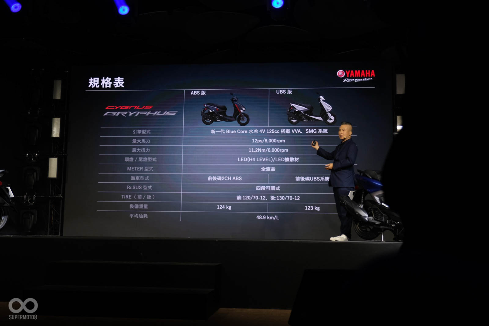先前外界對於Cygnus Gryphus究竟是不是勁戰車系的正統傳人有不小的疑慮,但今日發表會現場,YAMAHA擺出了一代到五代車款,由此可以確定Cygnus Gryphus就是勁戰車系的最新車款;這次YAMAHA也延續先前的車型策略,推出搭載ABS和UBS兩種不同煞車的車型和五款車色。