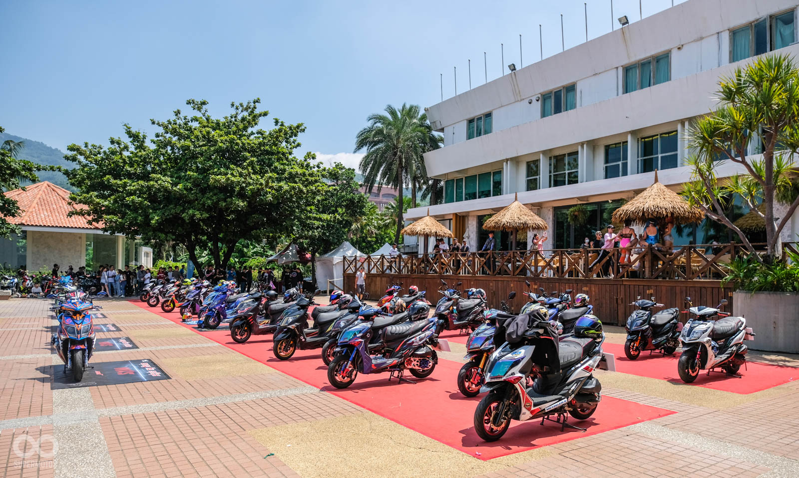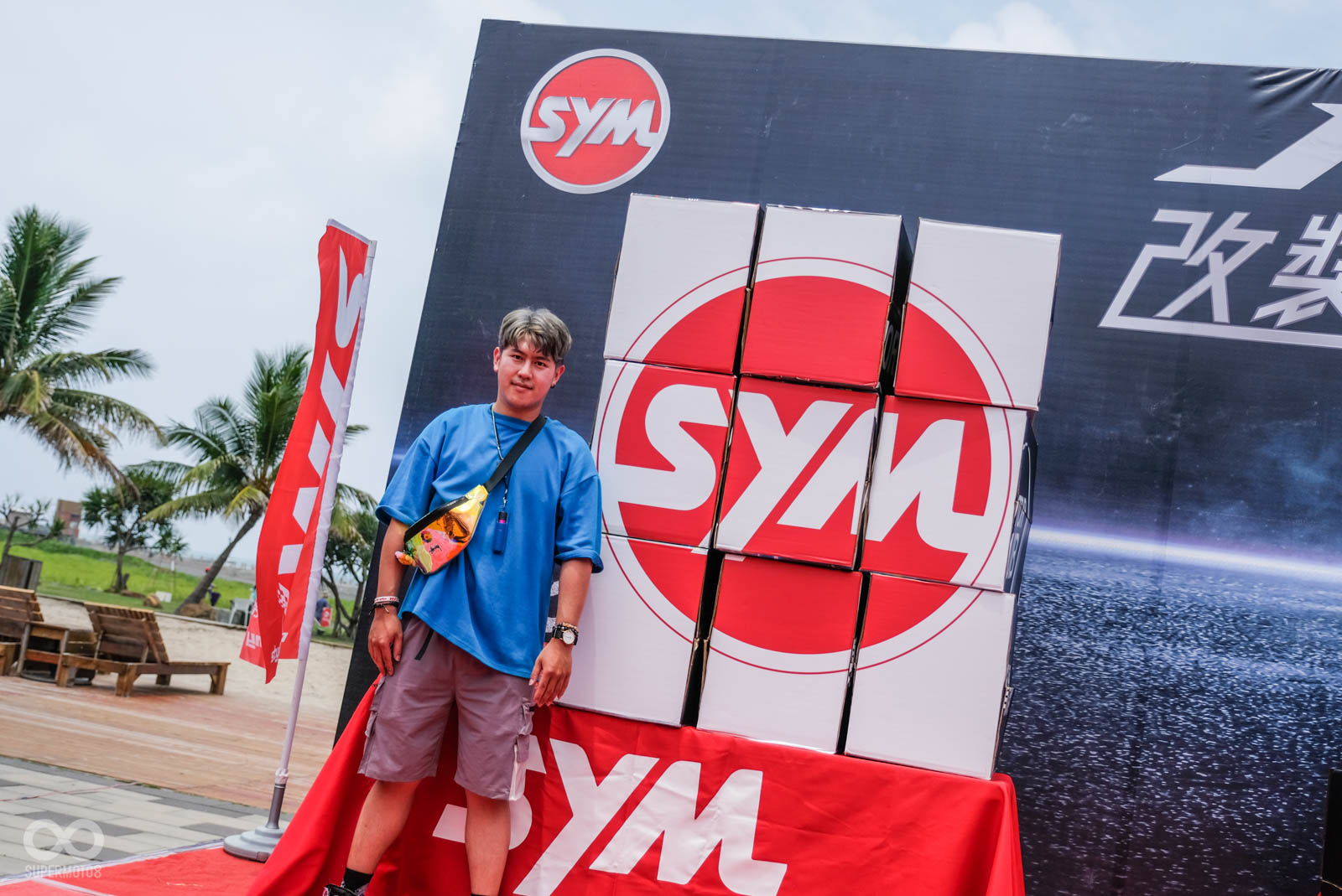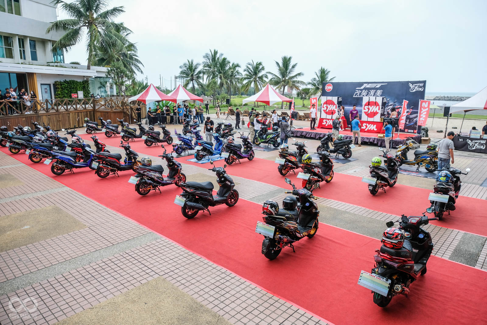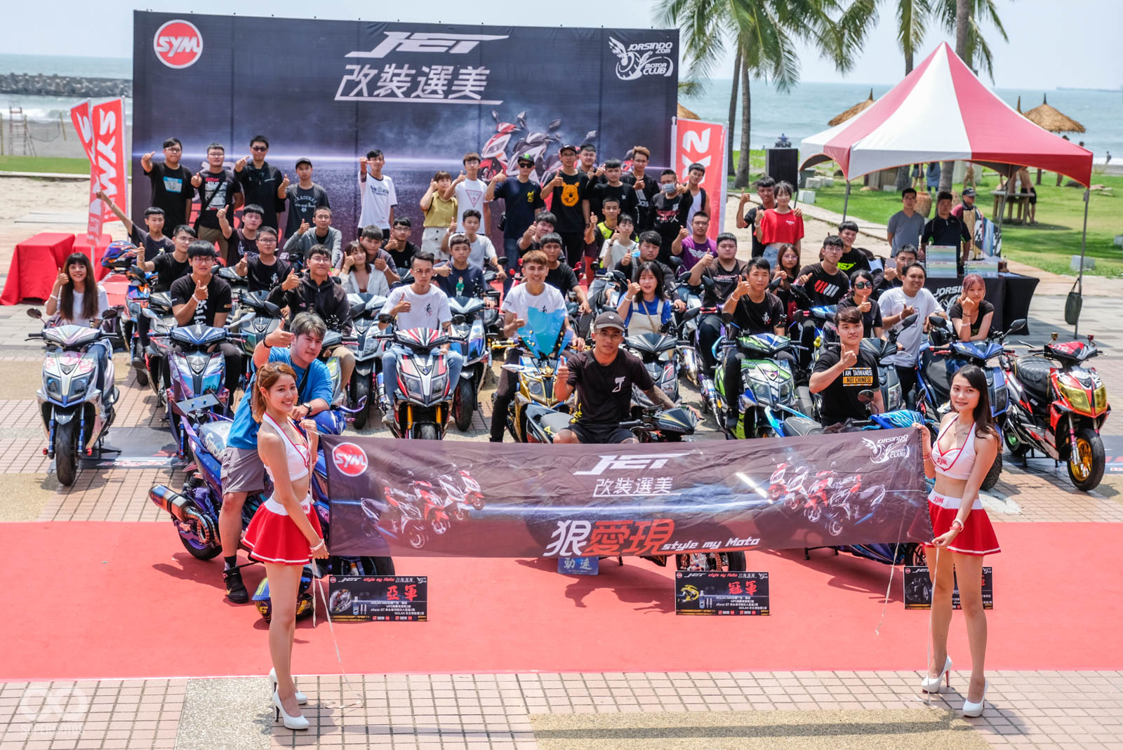 本次活動舉行於高雄西子灣沙灘旁,在活動會場就可以遠眺沙灘的地點相當舒適,車友一早報到後立刻會被引導至最近當紅的“模型盒”內拍照,主辦單位除了在模型盒幫每位車友紀錄最帥氣的人車照,拍完照後也引導車友停至指定停車位,一字排開的改裝SYM JET相當霸氣與整齊。