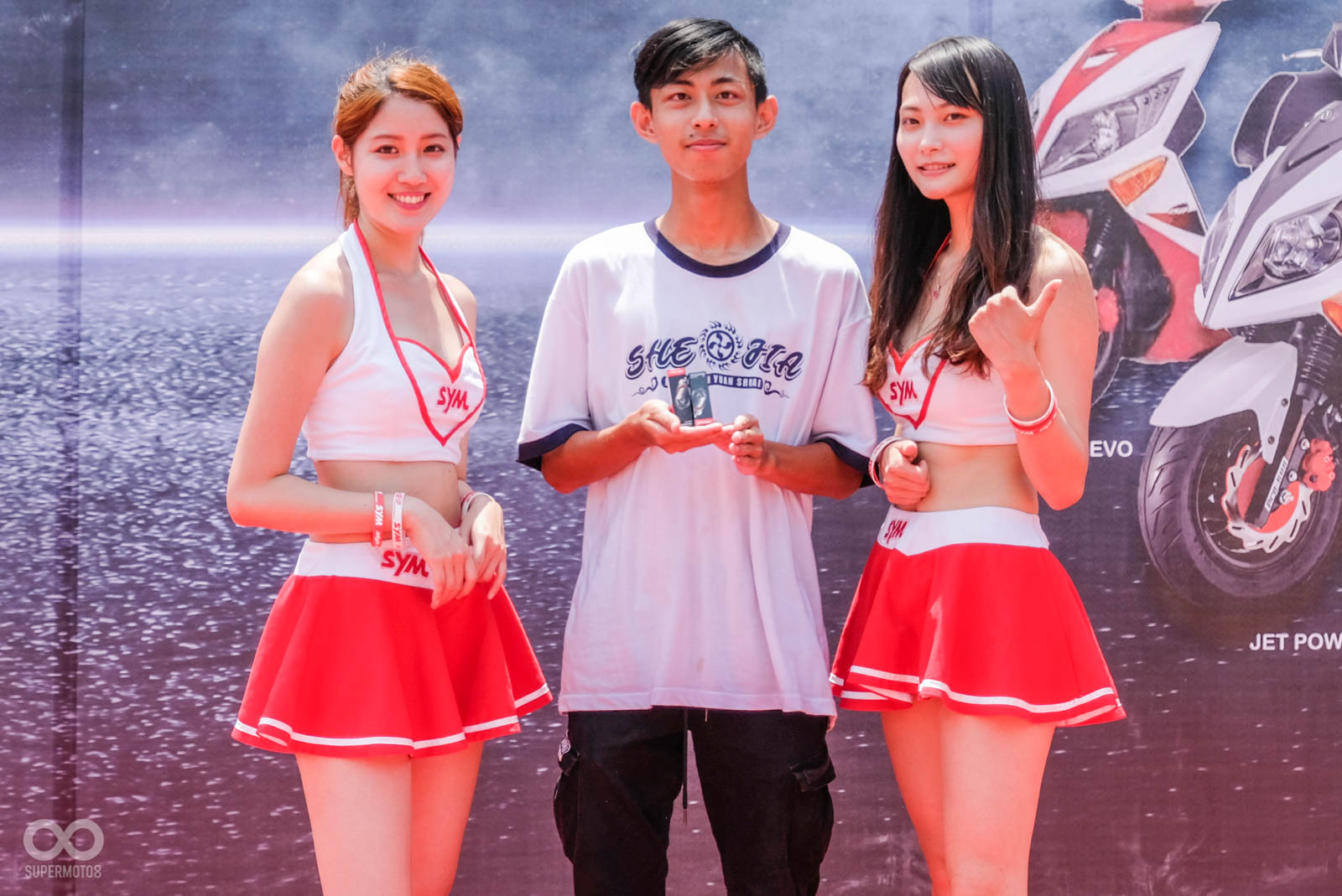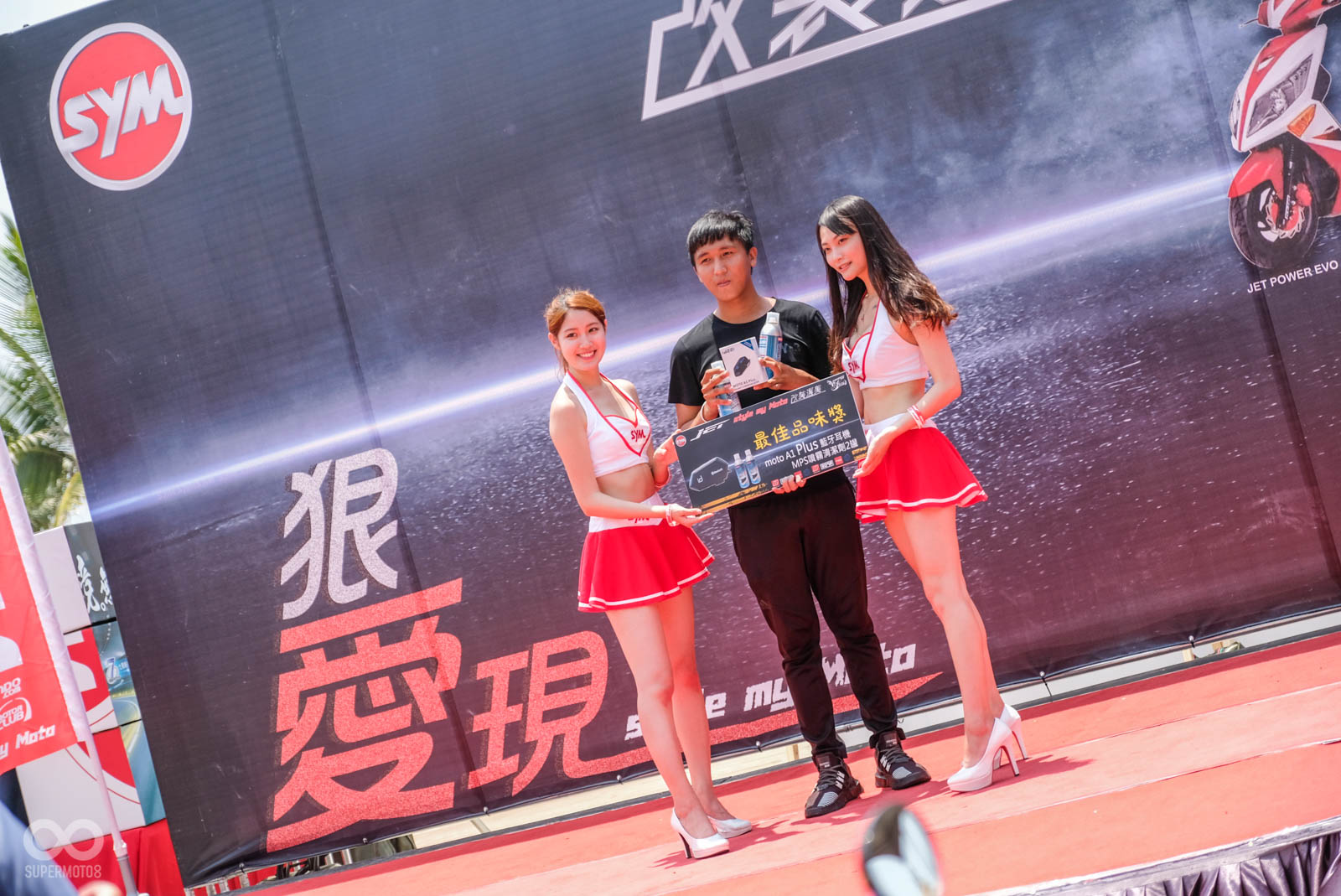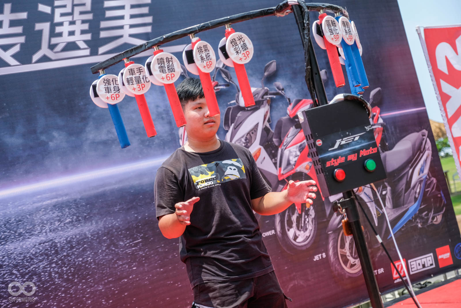 除了上述優點外,豐富的贈品更吸引大量的SYM車主前來共襄盛舉,即便颱風來臨前的高雄籠罩在炎熱高溫下,大量車主依舊相當不畏豔陽,來到舞台前進行小遊戲,SYM設計的小遊戲也相當特別,從「看車輛局部圖猜SYM車型」、「九宮格方塊拼圖」、「比反應快速地抓取遊戲」,以上關卡都與車輛有關,甚至最後的抓取遊戲,看板上還有許多有趣的改裝名詞,車台強化、強化曲軸等改裝零件用以計分使用。