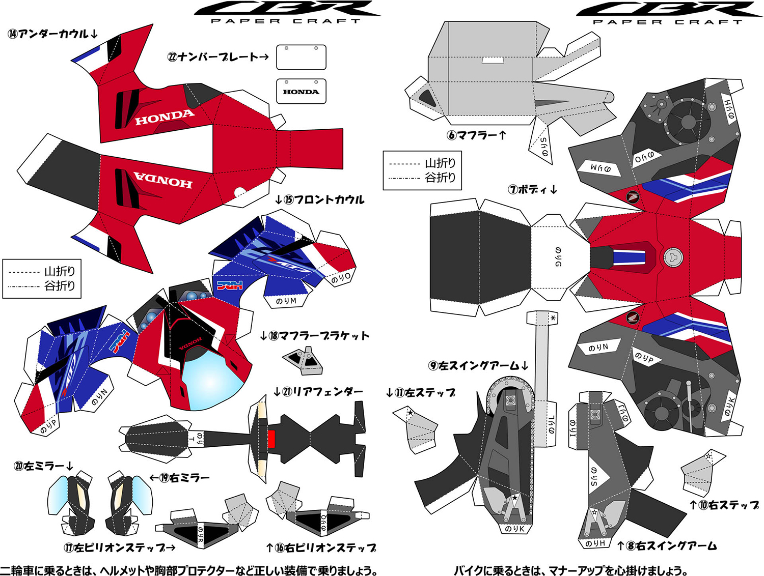 HONDA這次也特別提供兩個不同版本的檔案,分別為無塗裝的黑白版本和HRC塗裝版,黑白版本可以根據自己的喜好上色,創造獨特彩繪的CBR1000RR-R;而HRC塗裝版則可以透過彩色影印直接印出HRC配色的塗裝;HONDA也特別建議摺紙玩家使用0.21mm-0.22mm厚度的紙張,車輛摺起會有最佳的視覺效果。