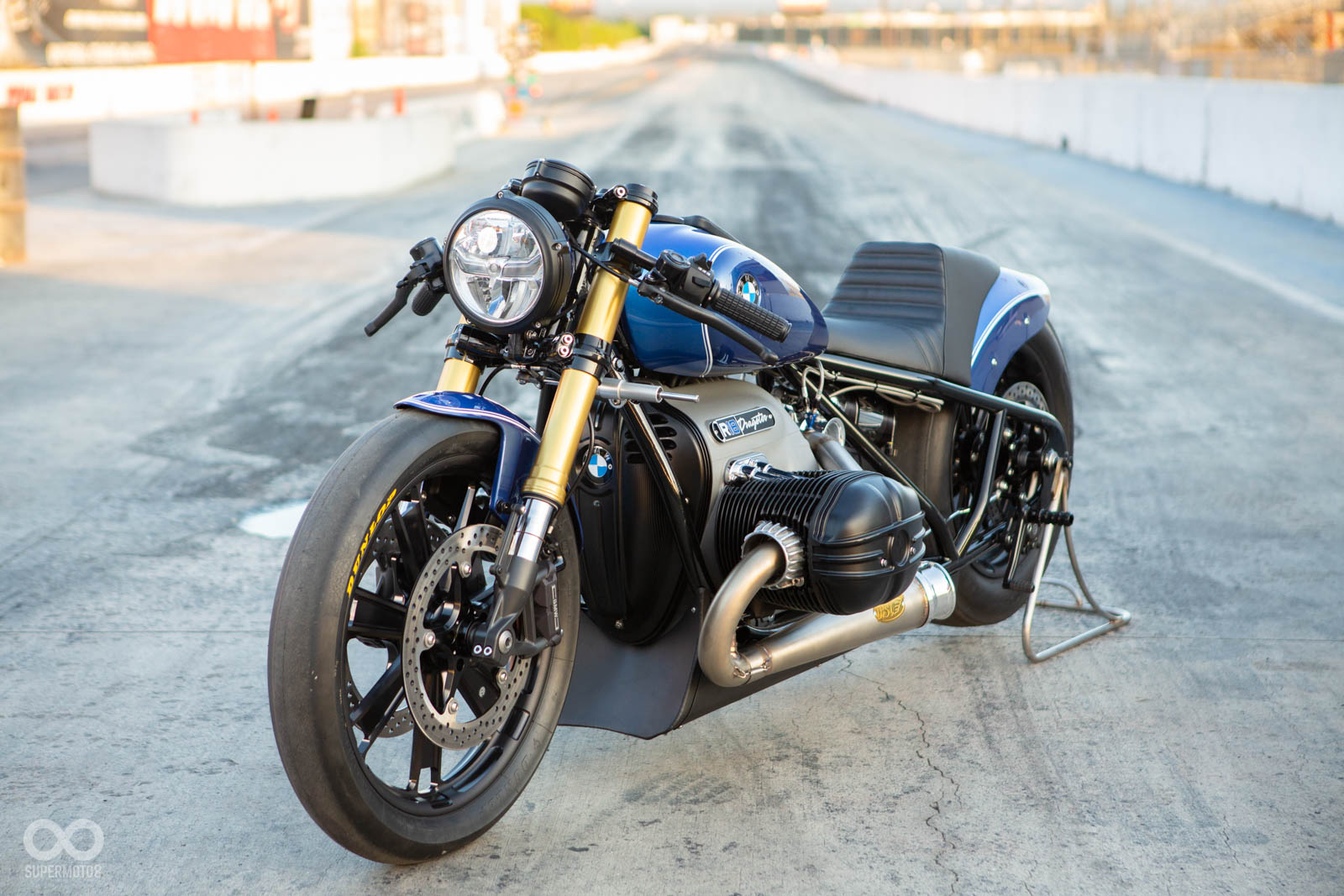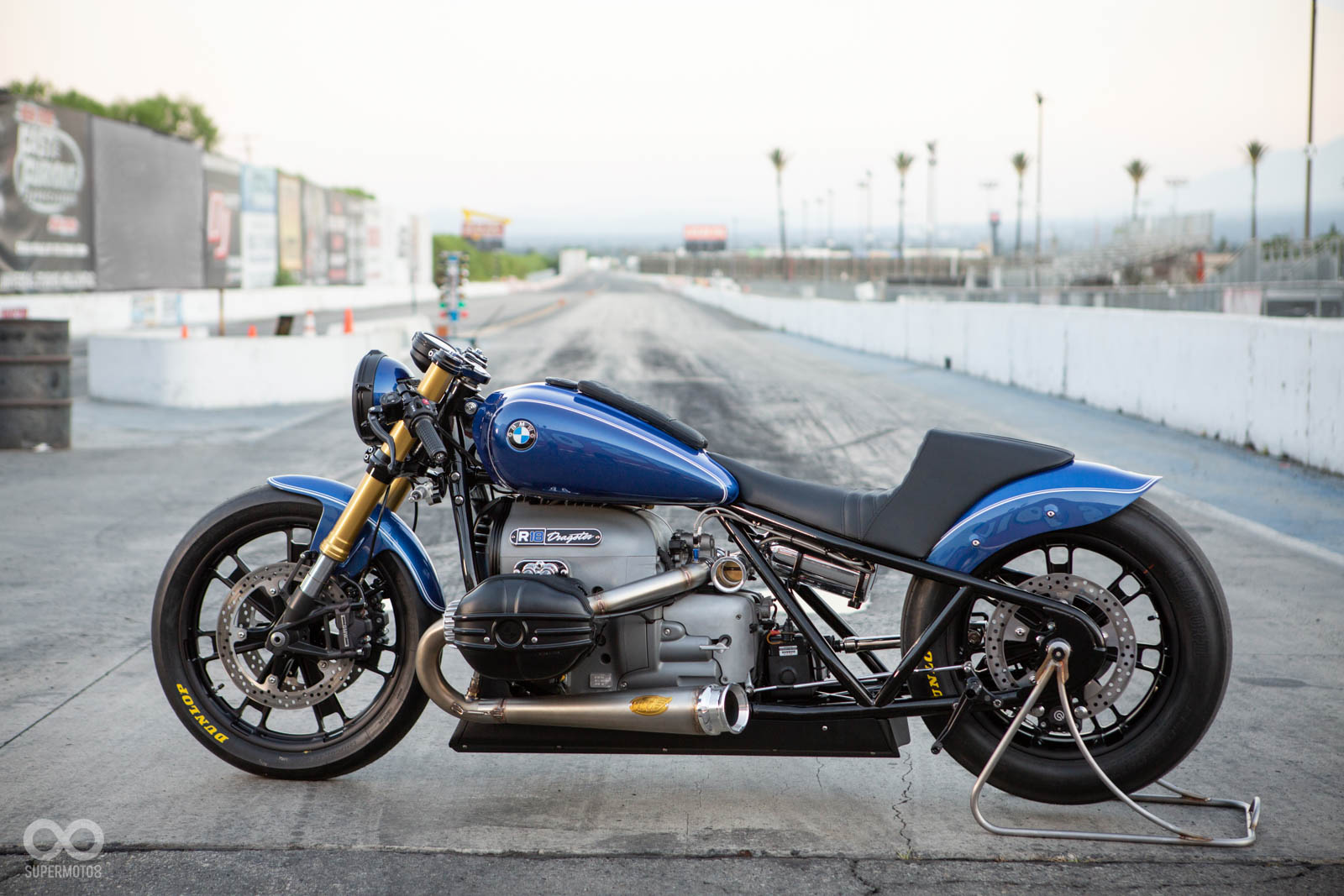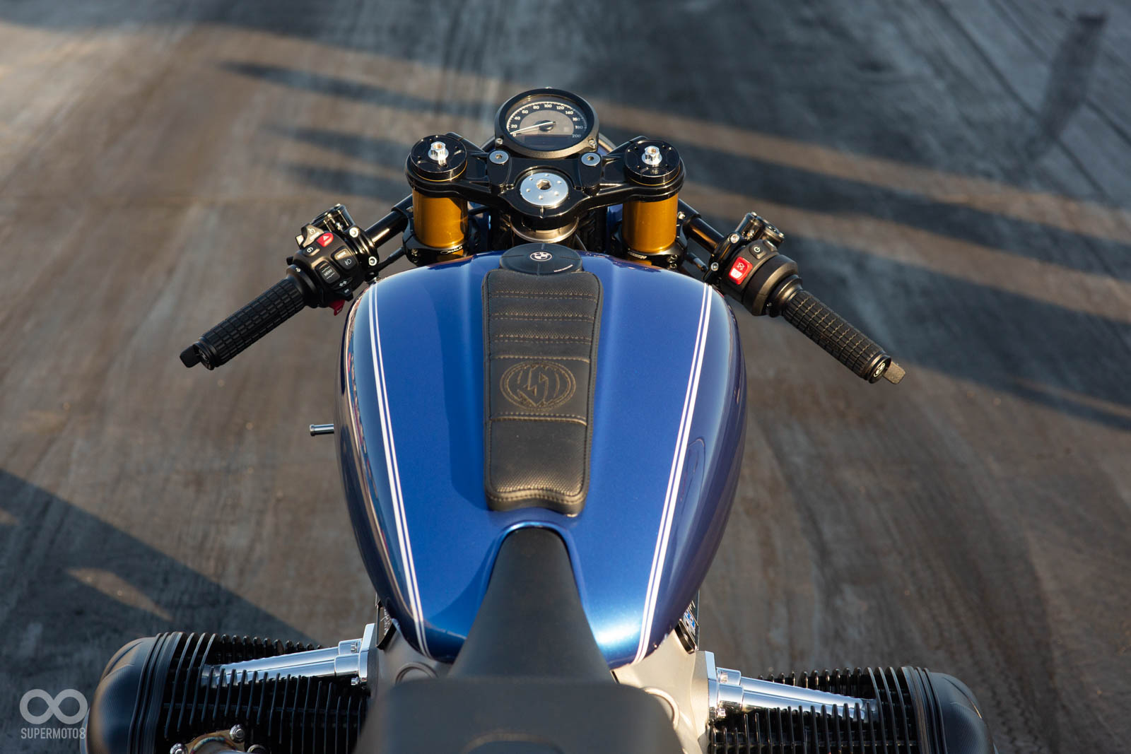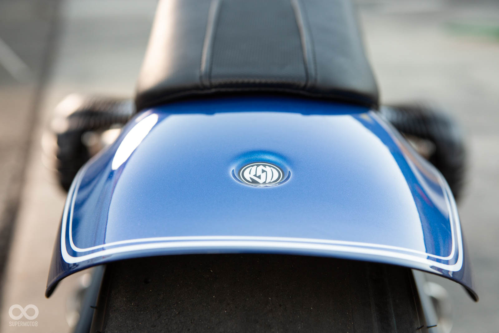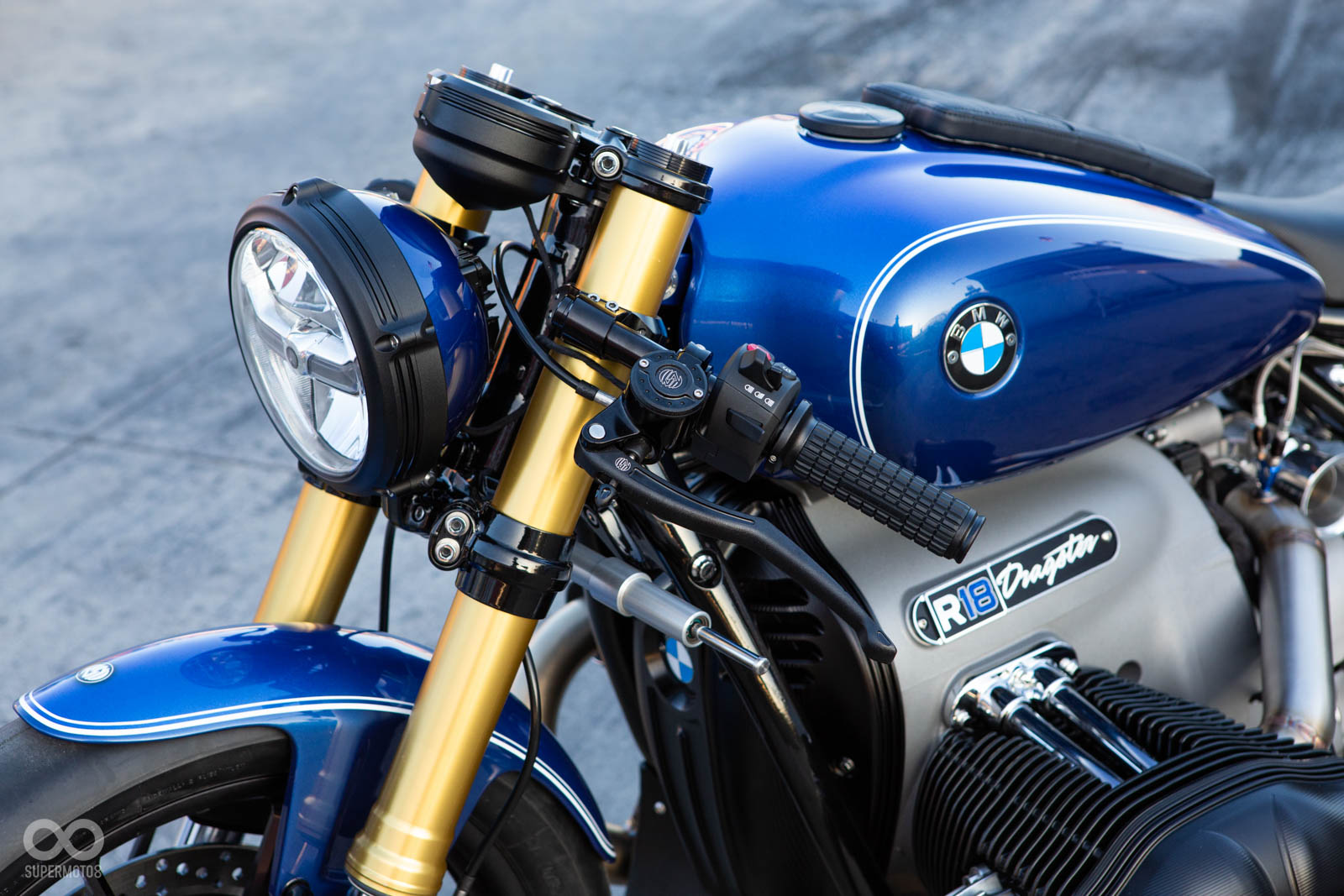 當然,作為一輛稱職的Dragster賽車,原先著重長途旅行的車款設定自然被Roland Sands拋諸腦後,例如前叉被R nineT的避震器取代,並改為S 1000 RR的前煞車系統。前、後土除都是從原廠品小修重烤而成,甚至油箱也是延用原廠製品,全車烤漆改為老BMW機車上常見的深藍色,配上白、金兩色線條呈現。