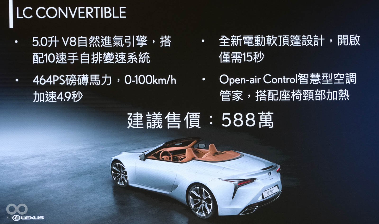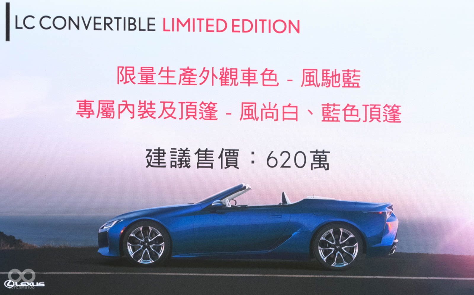 全新LC CONVERTIBLE於8月18日起正式販售,車輛相關資訊請洽LEXUS全台展示據點。亦可至LEXUS官方網站(http://www.lexus.com.tw)或致電LEXUS顧客服務中心0800-036036洽詢相關訊息。
