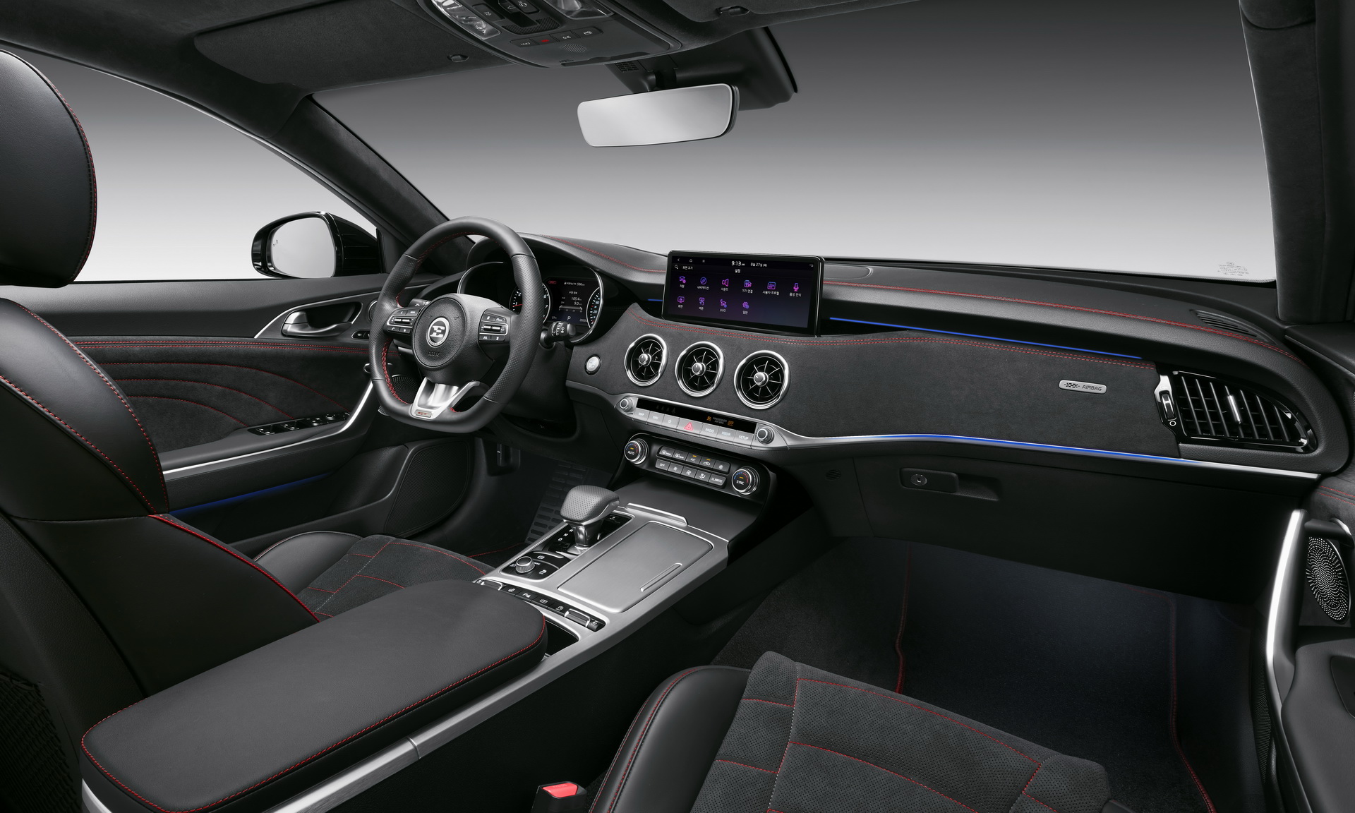 其他新奇車內配備像是有互聯功能,可遠端發動引擎,以及一些特殊國家可遠端啟動座椅加熱或者通風功能。安全配備部分,Stinger已經相當完整,改款後主動安全增加開門後方警示、更大視角的後方盲點偵測、車道跟隨輔助、高速公路駕駛輔助升級以及下車後座警報等。