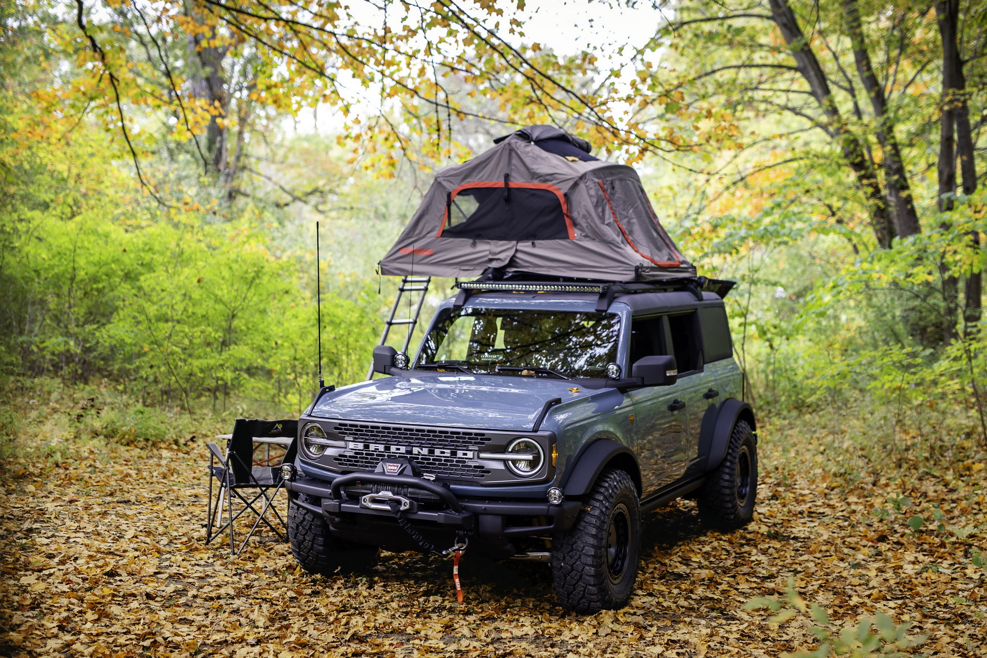 從車頭望去,與一般的Bronco無太大差異,Bronco Overland Concept其重點在於原廠所安裝的戶外配備。車頭有一個非常粗壯的保桿,上面安置一組絞盤,當車輛深陷泥沼或者困於山裡可以進行自救。車頂搭配上車頂架之後,可安裝Yakima的車頂帳篷,打開便能在車上過夜。車頂架前方有組LED燈條,車身四周有六組探照燈,提供夜晚時的照明更加清晰。