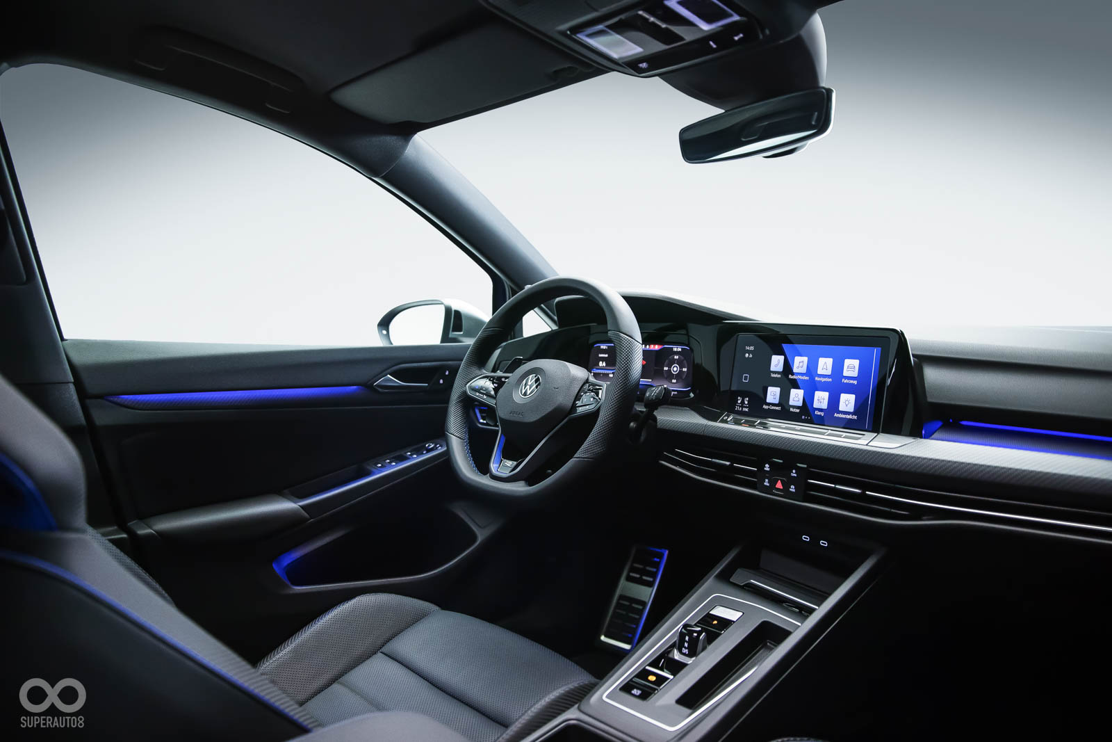 車內細節也加上藍色元素、R Logo點綴,賽車座椅、R版方向盤,與大量的碳纖維、金屬飾板彼此搭配,彰顯性能氛圍。