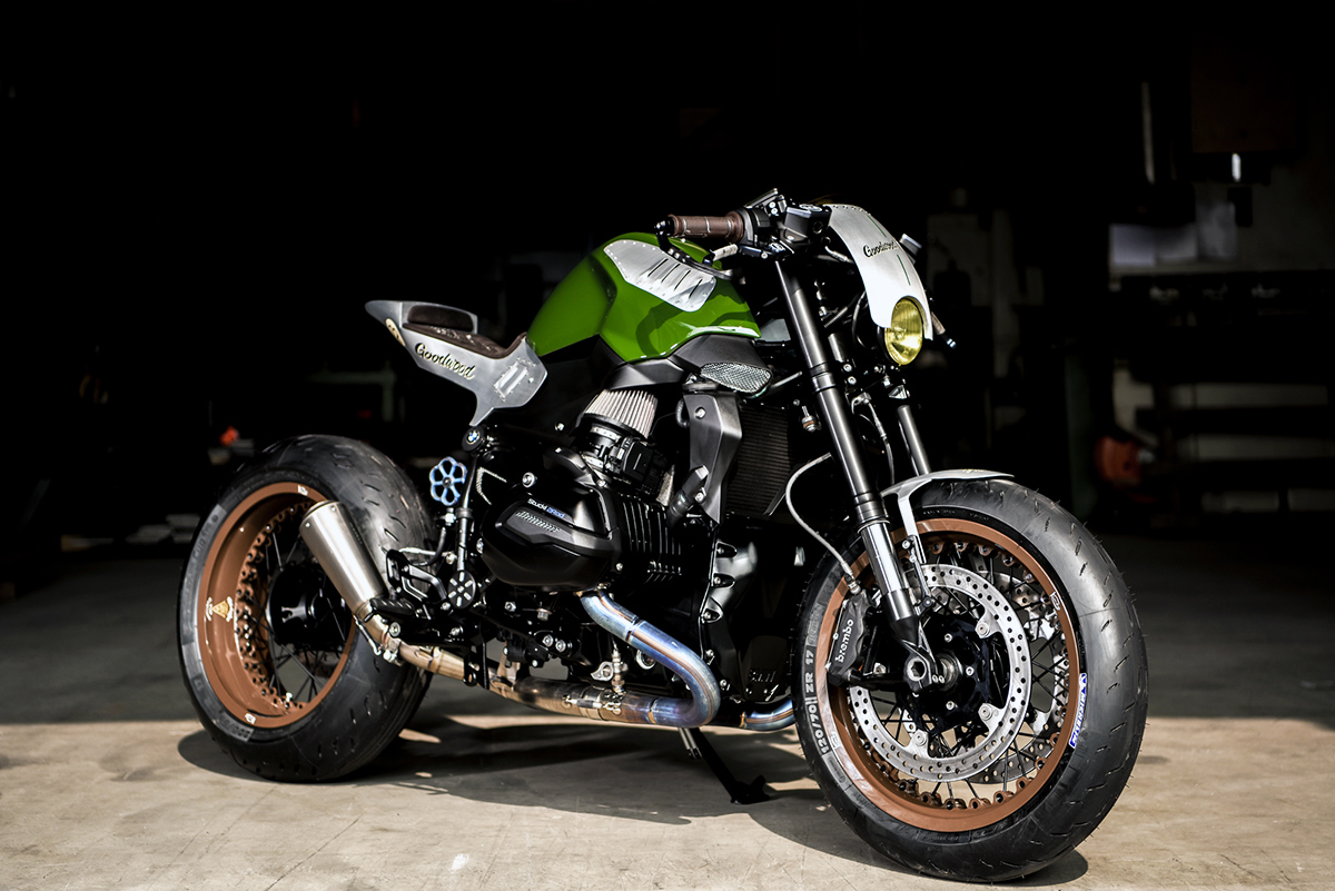 CAFÉ RACER給人的印象是圓潤且簡約,但是來自瑞士的VTR CUSTOMS決定要以不同的詮釋方法,賦予CAFÉ RACER新的意象。有別於CAFÉ RACER以往流線的車身設計,VTR CUSTOMS選擇BMW R1200R進行改改裝,以鮮明的水平對臥雙缸引擎輪廓為基礎,保留原廠油箱並加上手工打造的金屬飾板,車體後半段則改為單座短尾設計,由全手工打造,保留金屬原色未做上色及修飾,車頭罩也改為金屬飾板,透露出強烈的陽剛氣息,最後油箱改以英國賽車的草綠代表色,保有英國賽車的傳統識別。