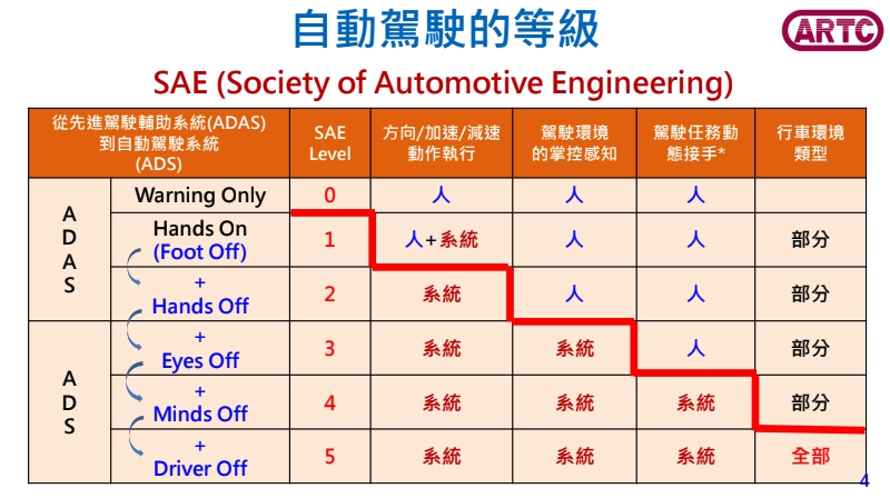 根據SAE的自動駕駛分級規範,從LEVEL0-LEVEL 5都有明確的定義,目前台灣販售車款多在Level 1、LLevel 2左右,通常在這些等級下,僅能算是輔助駕駛在駕駛時的工作,駕駛依舊要注意路況隨時準備拿回主控權,Level 3狀態下,多數駕駛工作則由系統接手,甚至雙手可以長時間離開方向盤,不過當車輛面對複雜路況時,依舊會透過警報、聲響,甚至自動滑向路邊避免意外發生。