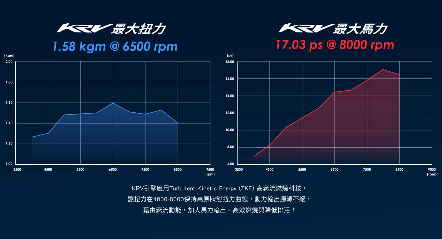 最大馬力17.03ps(@8000rpm)、最大扭力1.58kgm(@6500rpm)來自於KRV應用TKE高紊流燃燒科技(TURBULENT KINETIC ENERGY),讓扭力在4000-8000轉保持高原狀態的扭力曲線,動力輸出源源不絕,藉由紊流動能,加大馬力輸出、高校燃燒、大幅降低排汙! KRV兩款版本的配備比較表,也在官網做詳細的介紹,歡迎有興趣的消費者關注。