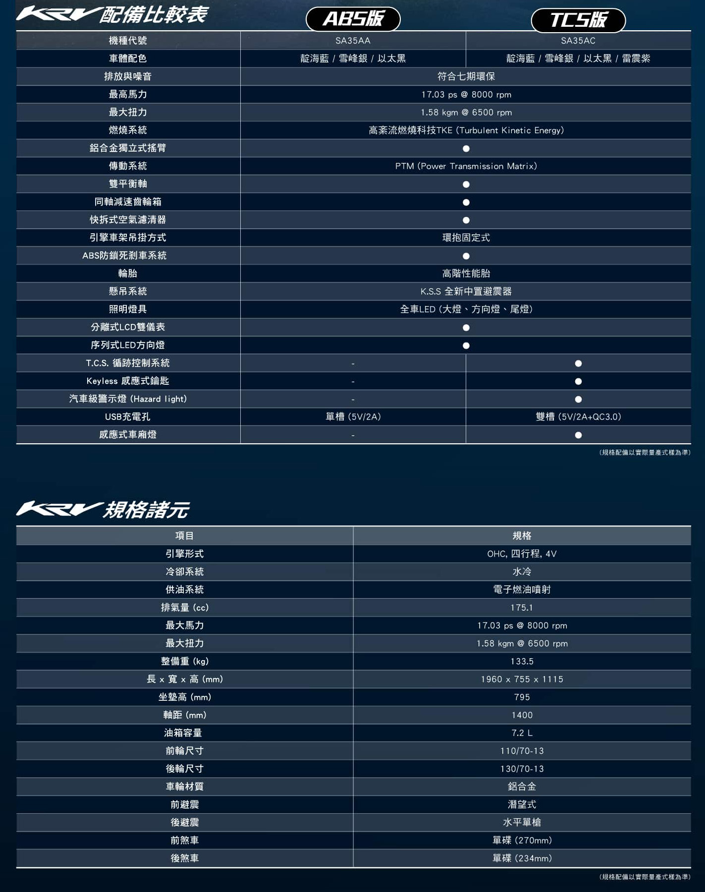 隨著價格公布,KRV更詳細的配備特色也在官網上曝光,KRV搭載全新開發的175cc 4V水冷引擎,