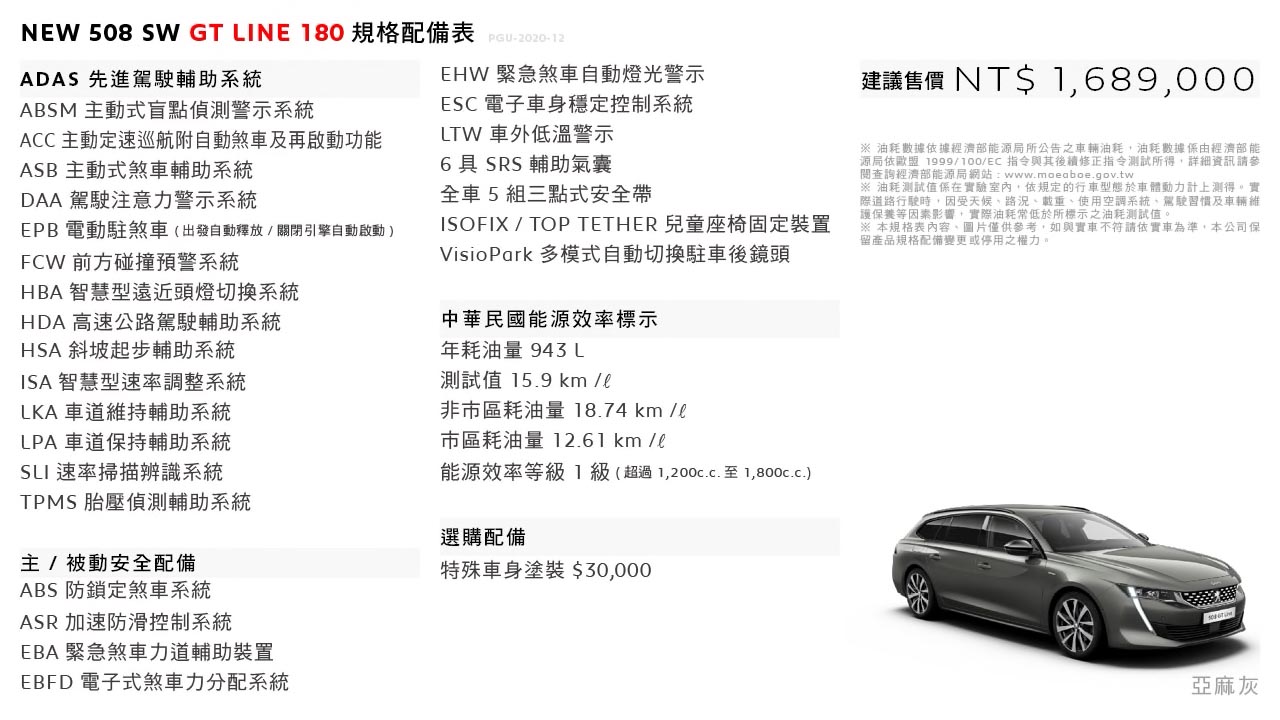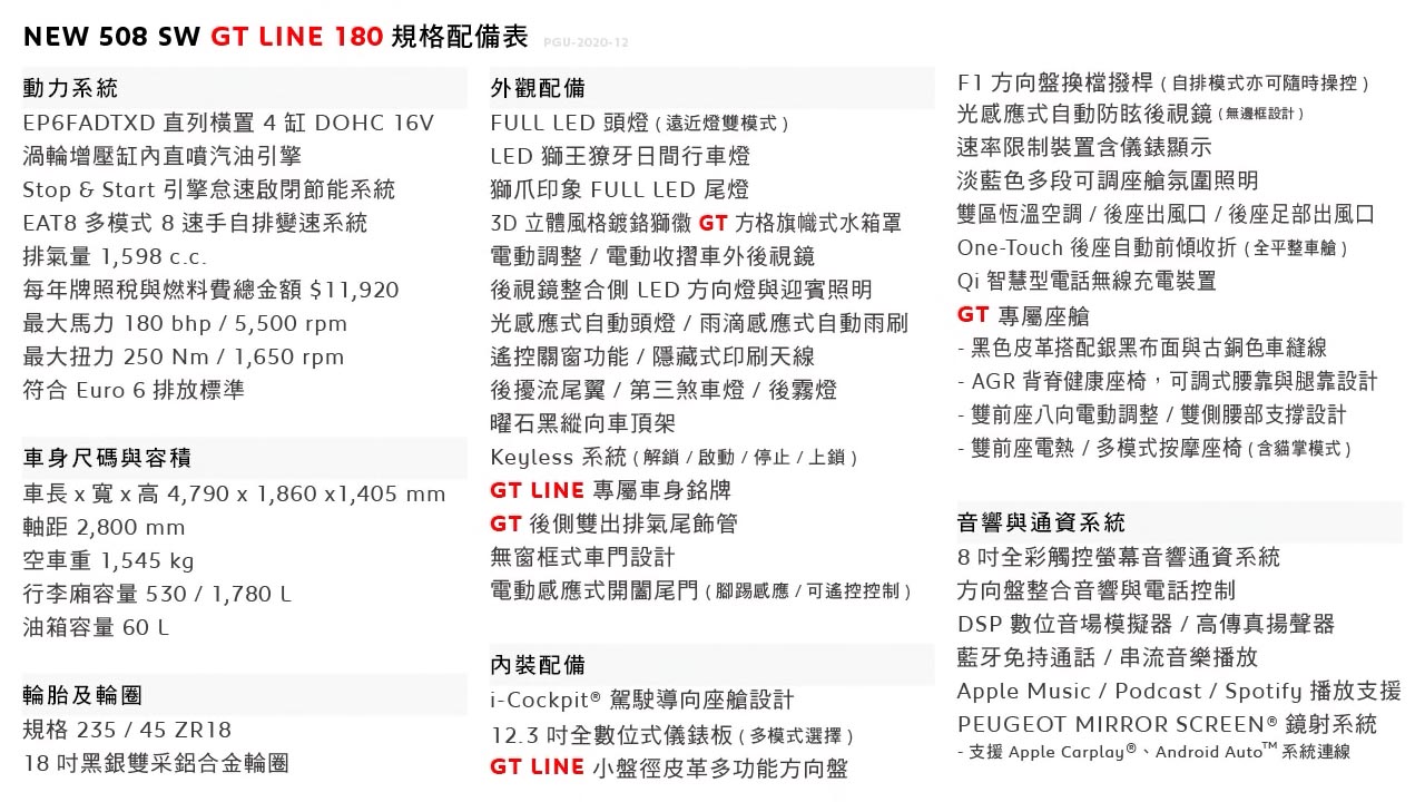 台灣導入的Peugeot 508 SW全為汽油動力設定,共分為GT LINE 180、GT LINE 225兩版本,皆配上1.6渦輪增壓引擎,馬力與扭力分別為:180hp/250Nm、225hp/300Nm,變速箱為EAT 8速手自排變速箱系統;目前台灣消費者注重的主動安全科技:ACC定速巡航、LKA車道維持輔助、LPA車道保持輔助、ABSM盲點偵測警示、ASB主動式煞車輔助系統、FCW前方碰撞預警、SLI速率掃描辨識等配備一應俱全!想看更多細節的朋友,可參考下方規格配備表;欲了解更多資訊的朋友,可以趕緊前往寶嘉聯合展間哦!