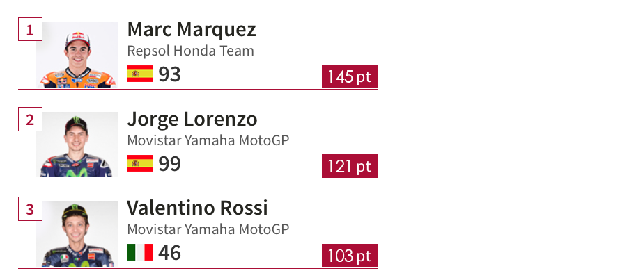 MotoGP第9站來到德國。在這多左彎賽道特性(左10右3),讓MICHELIN在本站首次提供車隊不對稱輪胎。氣象預報顯示,本週德國當地天氣處於不穩定狀態,在經過上站忽雨忽乾的艱辛賽事後,車手們在賽前訪問對於本站的天氣更顯擔憂。而狀況優異但運氣不佳的Rossi目前積分為103分排在第三,和Lorenzo相差18分,更落後第一的Marquez達42分,雖然過去Marquez在這表現強勢,但在天氣與輪胎選擇的巨大變數下,似乎一切都變得難以預料。