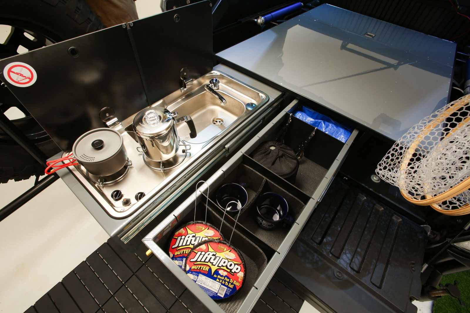 TRD Sport Trailer長得就跟TOYOTA Tacoma的後斗造型十分相似,但原先的置物空間已經被全數更換為露營專用設備,首先桌椅、廚具、冰箱、發電機、儲水箱等基本生活用品當然沒有缺少,TRD Sport Trailer更可以使用專屬升降平台達到空間極大化。