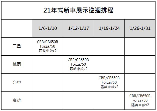 HONDA Motorcycles將在1月6號開始在三重店展示2021年式新車型,包含有CB650R、CBR650R、FORZA750以及兩款神秘新車,而這兩台神秘新車從剪影看來,應該就是CMX1100 Rebel和X-ADV,對這幾台新車有興趣的朋友,可以查閱HONDA提供的巡迴展示時間表,前往鄰近的展間賞車。
