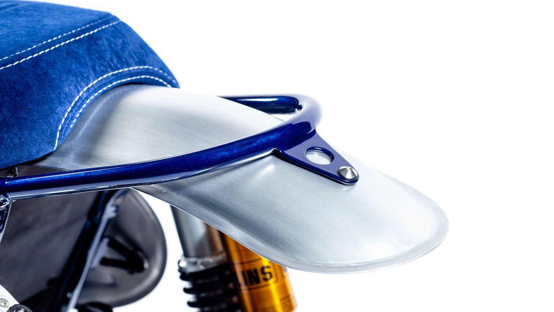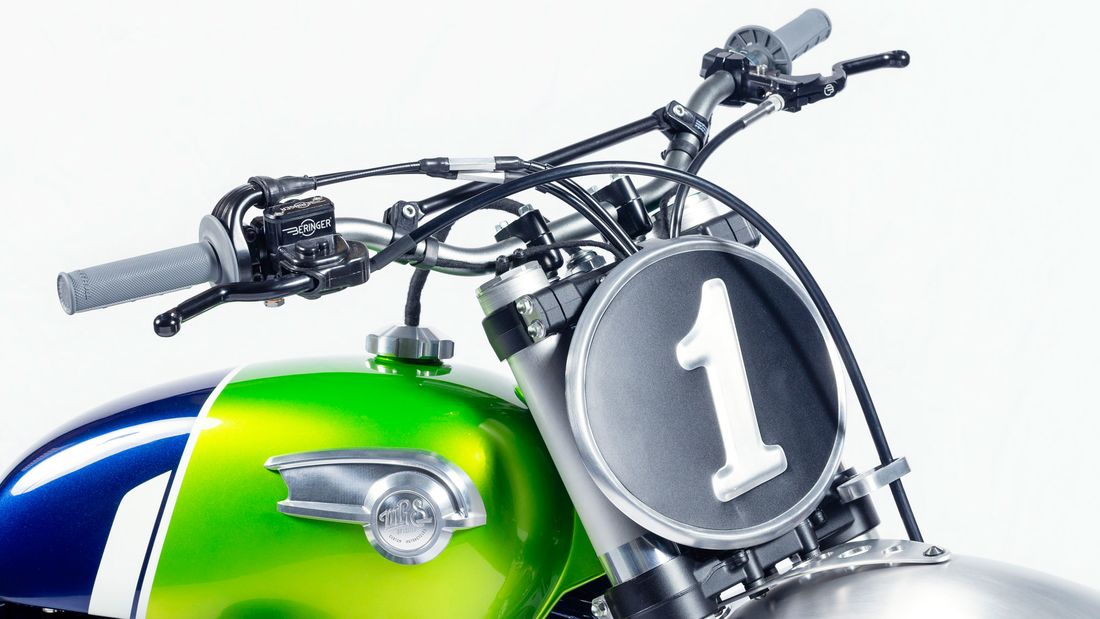 車頭部分Mário Raphael Soares移除了原先復古味十足的圓燈,改為更狂野的Cross號碼牌,握把同樣換上越野用的Renthal寬把與握把套,左右手開關大幅簡化為只有啟動和引擎開關;車身左右兩側使用訂製的鋁質號碼牌側殼,排氣管則是使用Mário Raphael Soares親自手作的不鏽鋼左右雙出直通管。