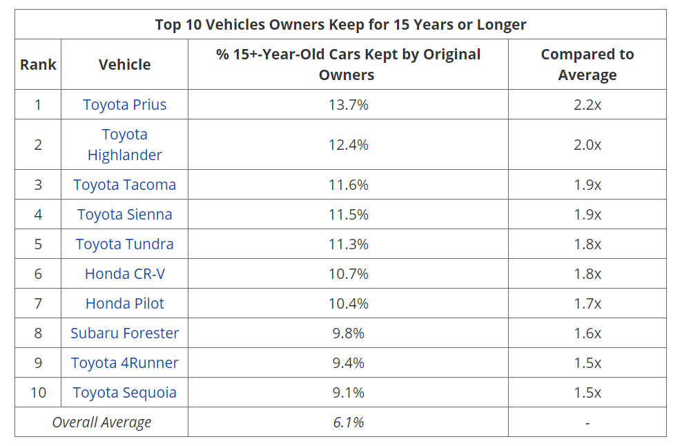 一輛車究竟要開多久才算久?美國汽車研究機構iSeeCars最近公開一份報告,針對於1981~2005年出廠、且在2020年售出的66萬輛二手車進行分析及統計,哪些品牌及車款的車主最有可能將愛車持有「超過15年」,並做出最終排行。結果不出所料,前十名清一色皆為「日系車」,但比較驚人的是,10輛車之中Toyota不僅就佔了7輛,還一口氣包辦前五名!而第一名正是鼎鼎大名的油電車先驅Prius!