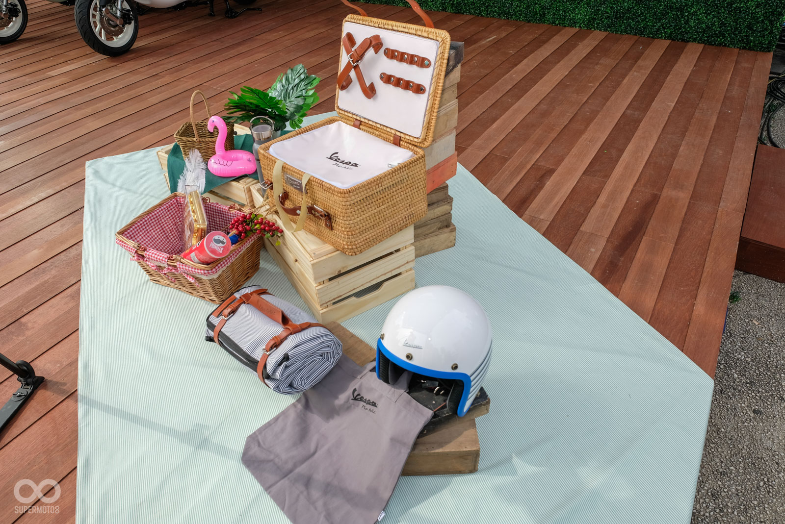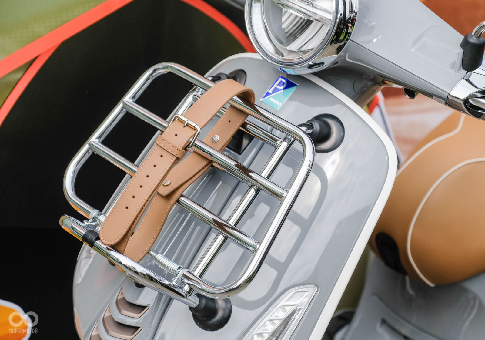 VESPA Primavera Pic Nic特仕版有多項適合野餐同時兼具實用性的配備與活力十足的車色細節,例如標配的前後書包價與棕色綁帶,大幅提升實用性與質感;棕色細節點綴於領結飾蓋、車側造型貼、腳踏墊、坐墊。