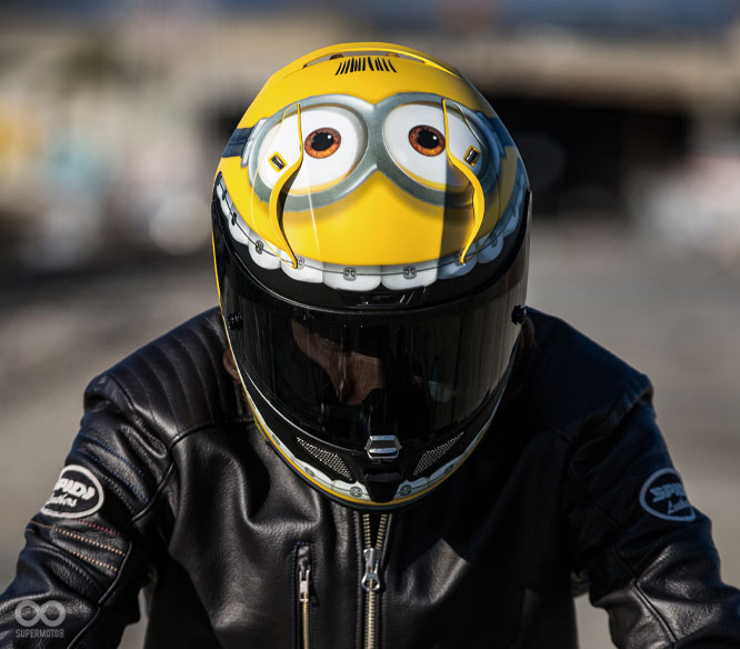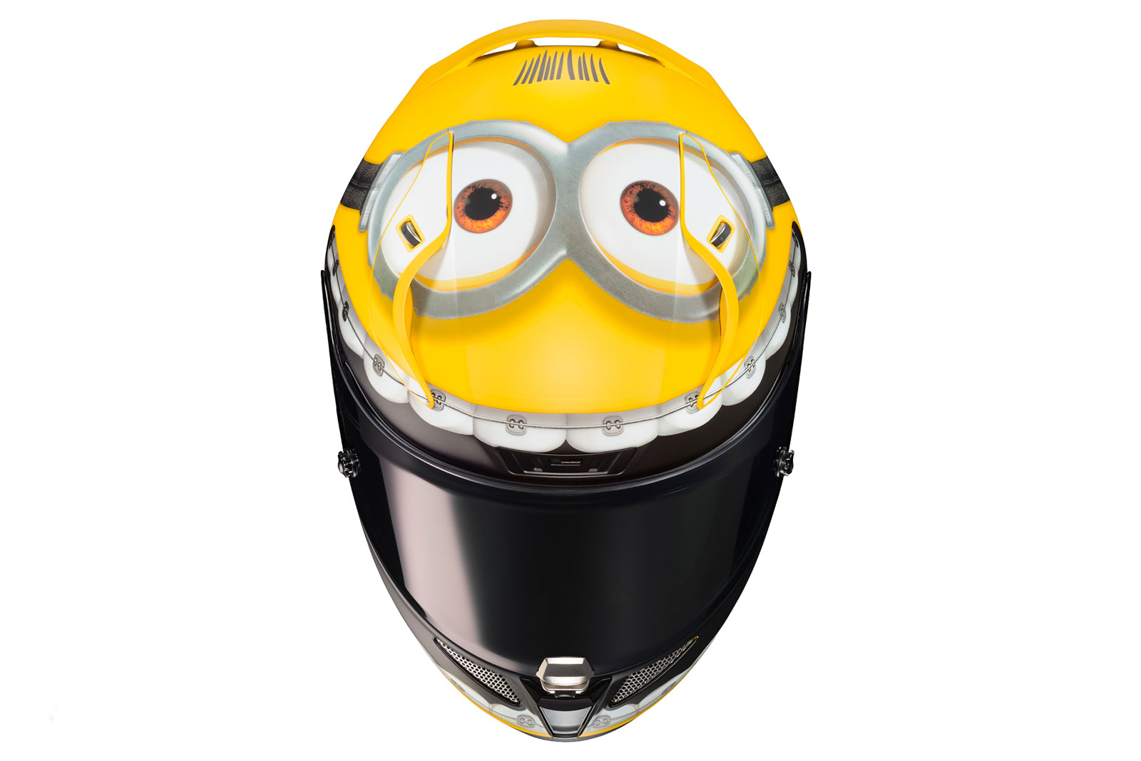 我想小小兵的呆萌身軀搭配上黃澄澄的皮膚,加上電影中有點少根經的特性,絕對是許多大人小孩喜歡的原因之一,本次的聯名安全帽整頂就採用黃色塗裝,並可在頭頂看到小小兵招牌大眼,可愛的頭髮也沒有缺席在彩繪上,嘴巴則是巧妙地融合進鏡片中,眼尖的你可能還可以發現到牙套牙齒的角色,就是小小兵2中的主角之一。