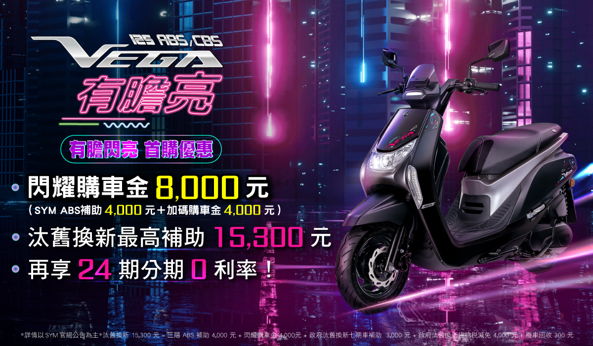 1. 閃耀購車金8,000元 (SYM ABS補助4,000元+加碼購車金4,000元,皆電匯)