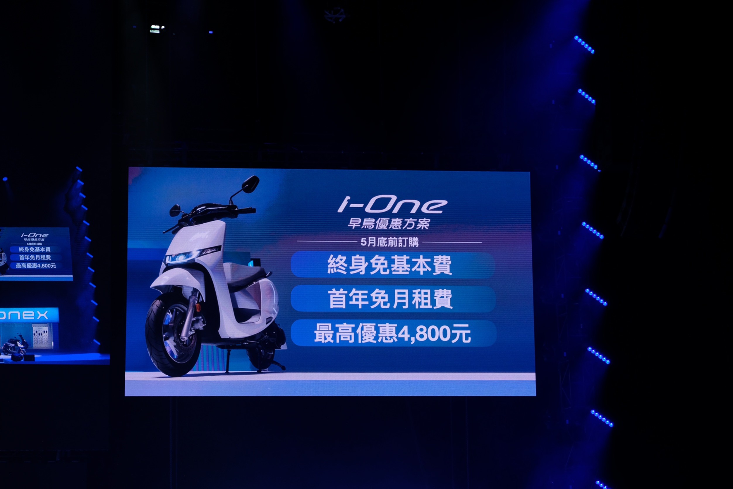 現場公布i-One的早鳥購車優惠,只要在五月底前訂購i-One就能享有終身免基本費、首年免月租費,另外還有4,800元的早鳥購車優惠。