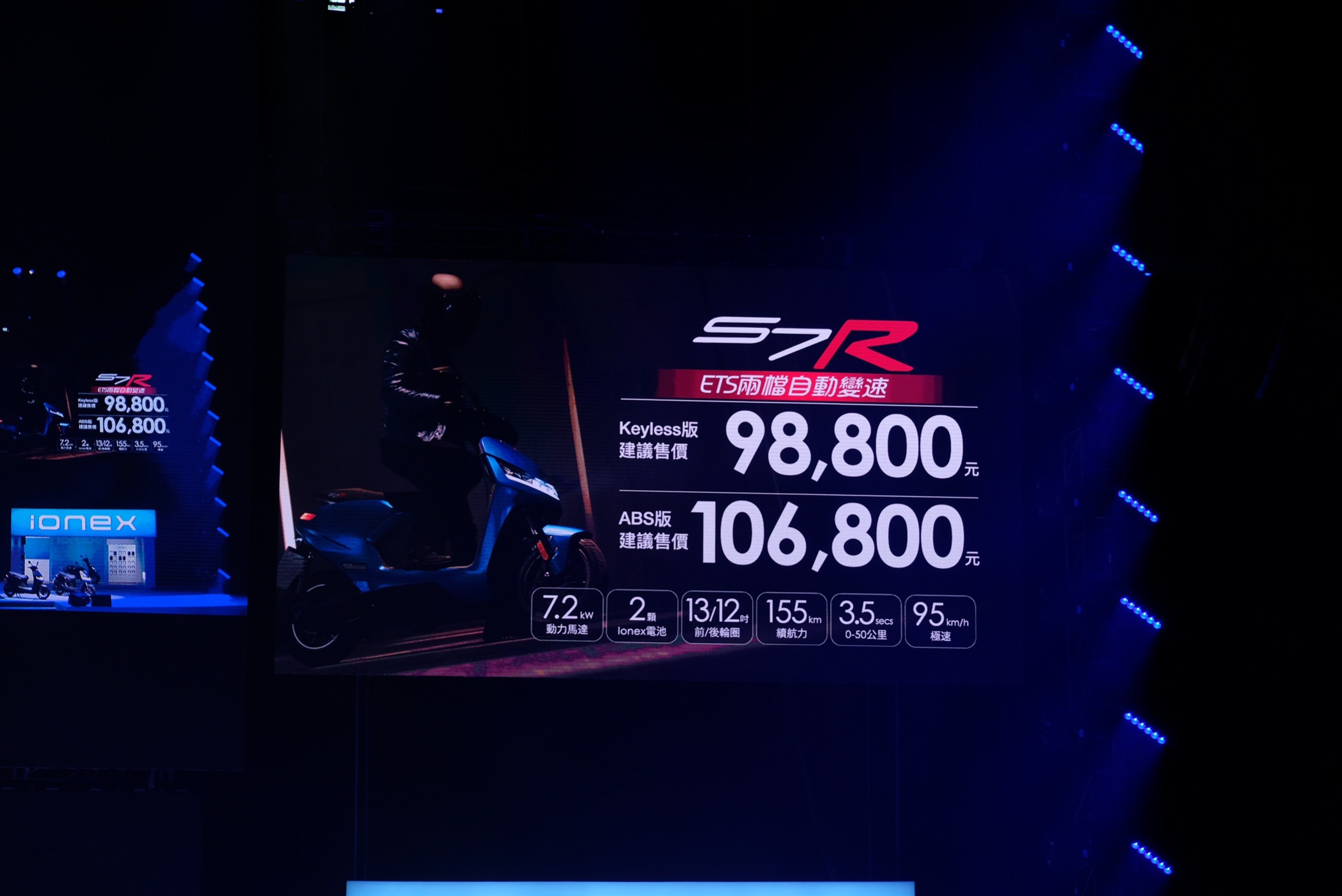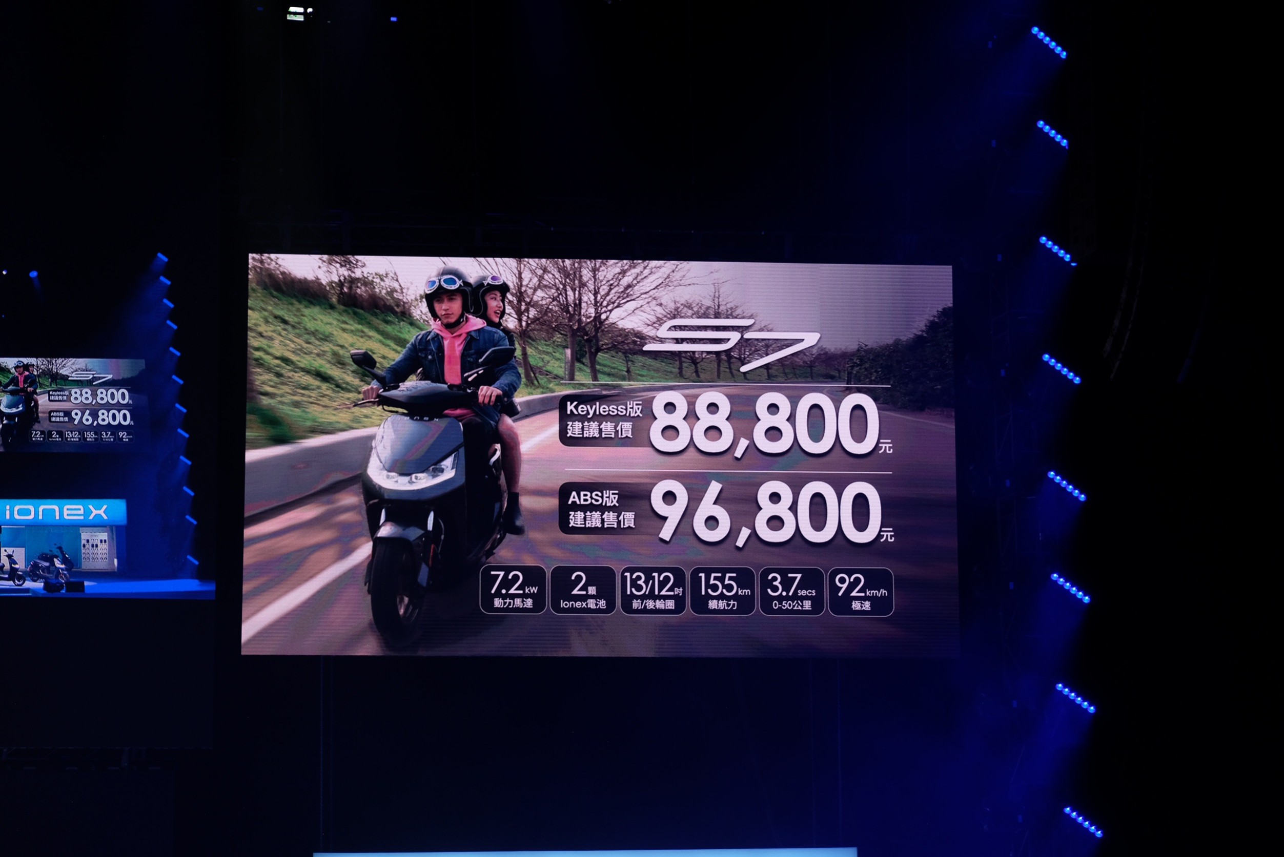 KYMCO今日選在台北流行音樂中心舉辦Ionex 3.0全面超越發表會,發表會上KYMCO帶來全新的Ionex 3.0電動機車系列,包含有主打都會通勤的i-One、S6,以及更熱血、性能的S7、S7R四台新車;其中最受矚目的就是S7系列雙車,動力使用7.2kW馬達,擁有155公里最大續航、0-50公里加速3.2秒,極速為95公里的強悍性能表現。