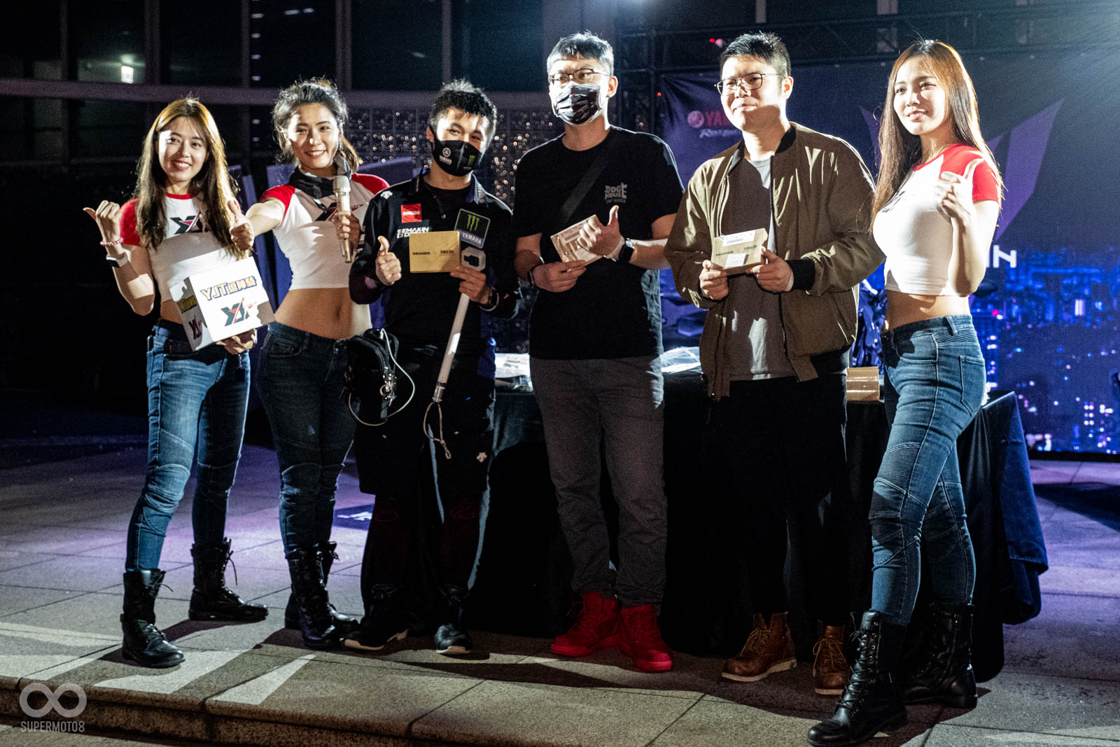 在享用完晚餐之後,車友們也在後方的舞台上拍攝大合照留影紀念,同時在電影播放之前,也一如往常地舉辦抽獎活動,獎品從實用的手機架到防摔衣通通有,品項非常豐富。
