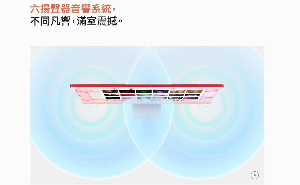 APPLE也針對音效部分進行提升,新的iMac搭載6顆音響,全新揚聲器系統支持杜比全景聲和Spatial Audio 空間音頻。