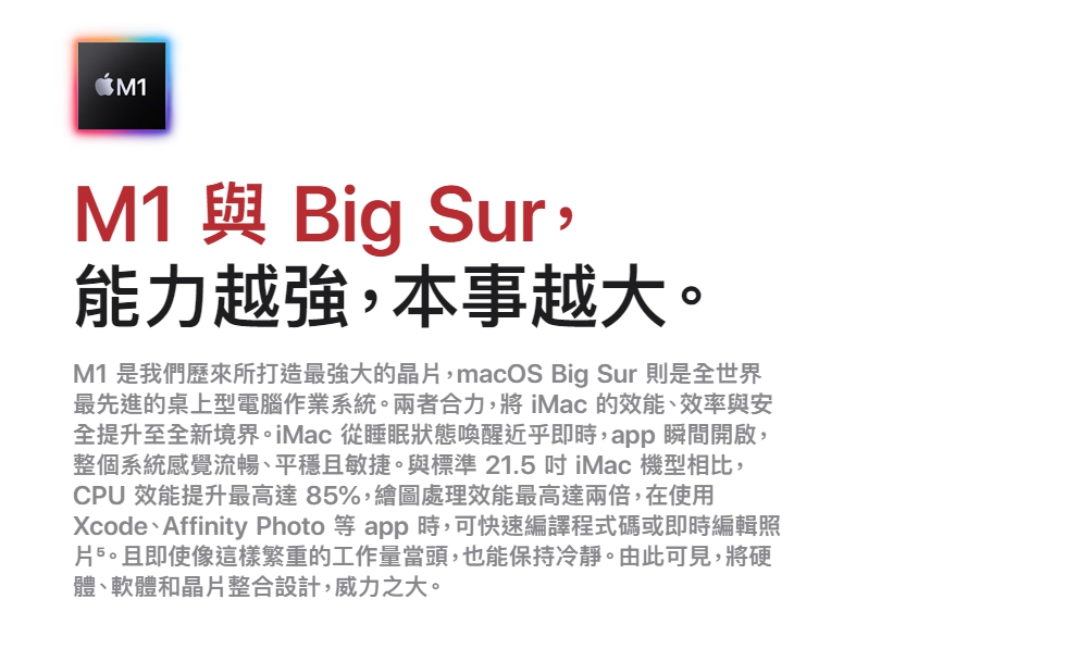 全新的iMac除了在外觀上變得更多采多姿之外,內在也因為獲得M1晶片低工耗的優點,CPU效能獲得最高達85%的性能強化,體積更是比上一代減少50%,重量僅有4.5公斤。