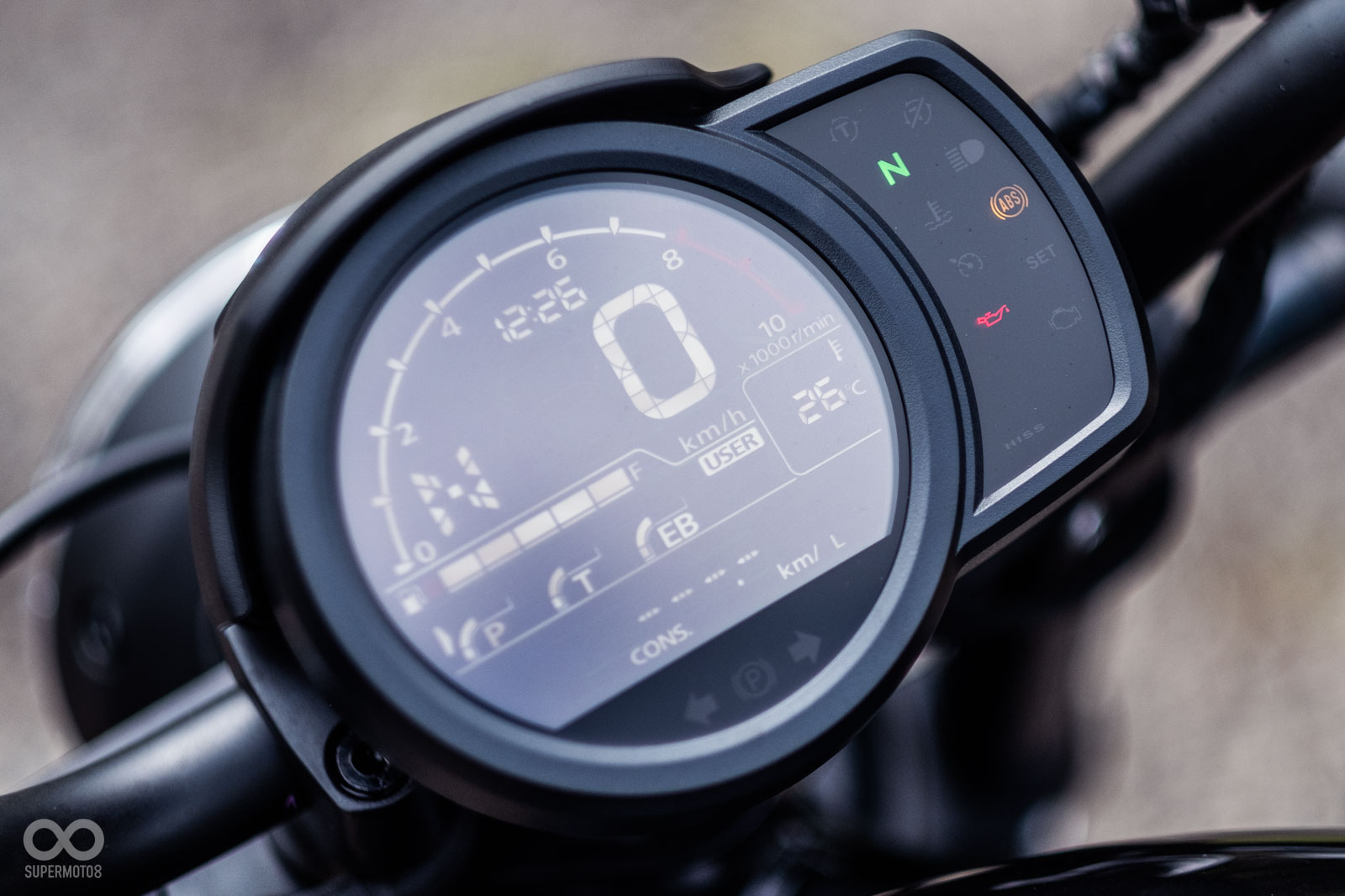 因應以上多元的控制項目,REBEL 1100擁有全數位的單色儀表,但這顆儀表就如同650車系、CB1000R的儀表一樣出現戶外使用可能因為配色產生辨識度降低問題,在實際騎乘時辨識度稍差,需要花較多時間才可以清楚快速辨別儀表資訊。