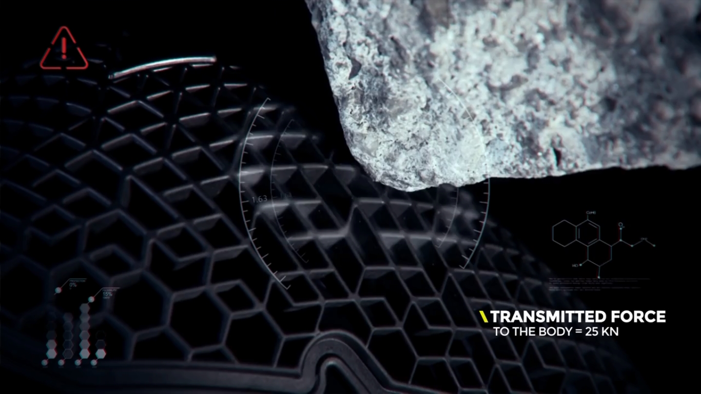 Pro Armor從正面看去結構類似蜂巢,六角形是大自然中最為強壯的幾何形,在蜘蛛網、葉脈甚至是細胞都能看到,從側面看去圓弧曲面則是參考烏龜與犰狳這些自然界中防禦大師的甲殼曲線設計而成,DAINESE利用強度高且兼具韌性的高聚合橡膠為媒材,以六角形為單位形建構曲面,依分布位置不同六角形內的結構也略有不同,讓護具在擁有優秀保護力同時也兼顧穿戴舒適性。
