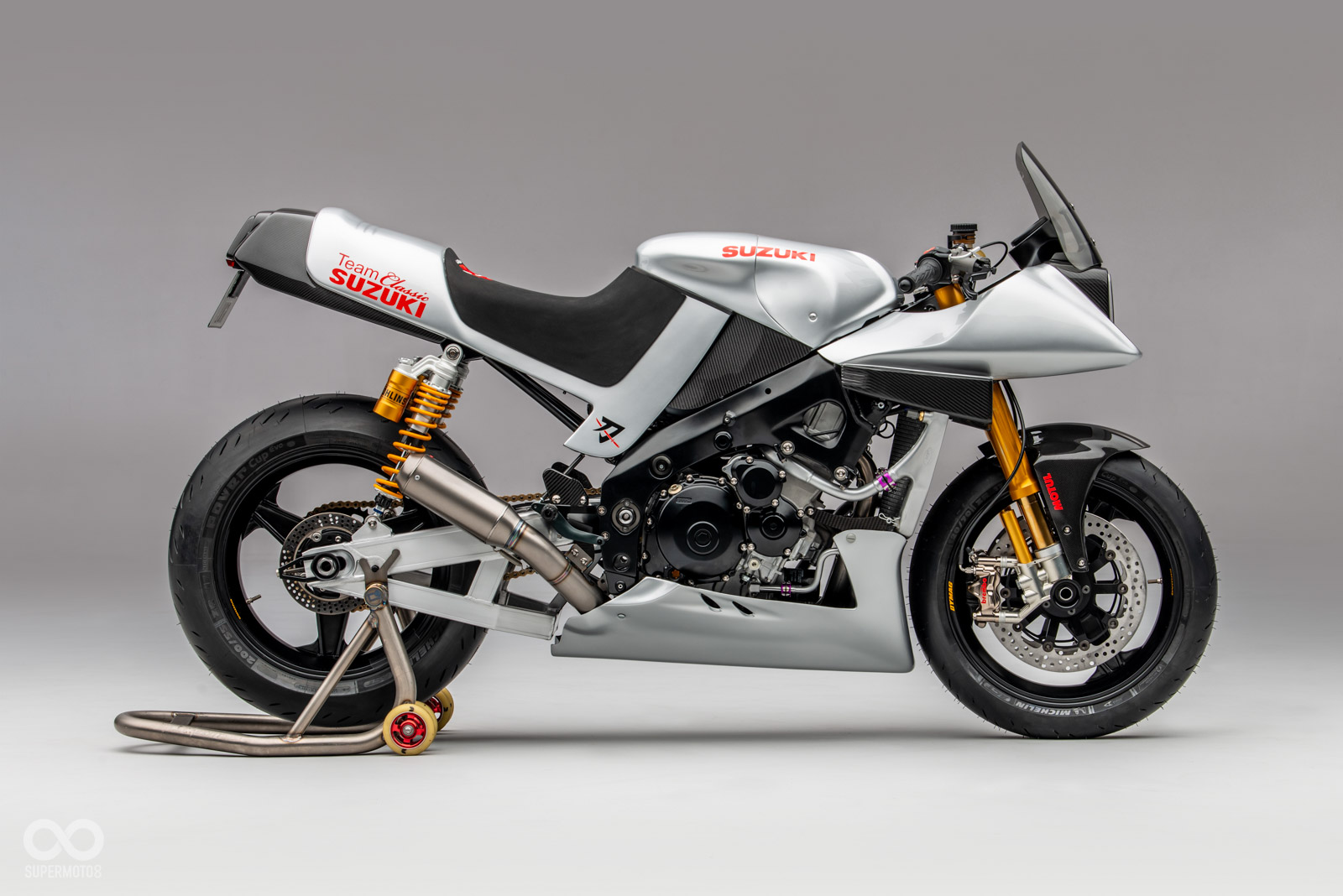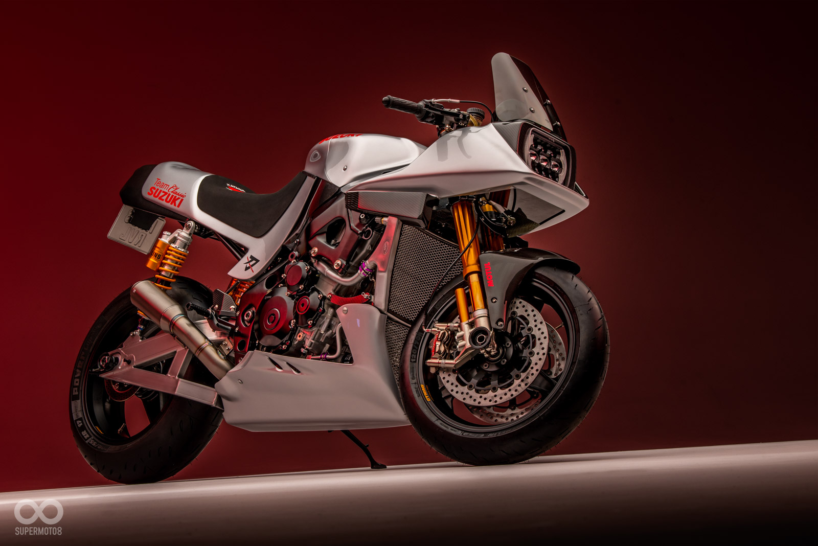 全車改裝項目不只外觀精進,老實說這應該不算是一台KATANA,這輛車是Team Classic Suzuki透過2008年Alstare車隊的GSX-R1000(K8)廠車改裝而來,所以腹內搭在當家阿魯引擎+200匹驚人動力。