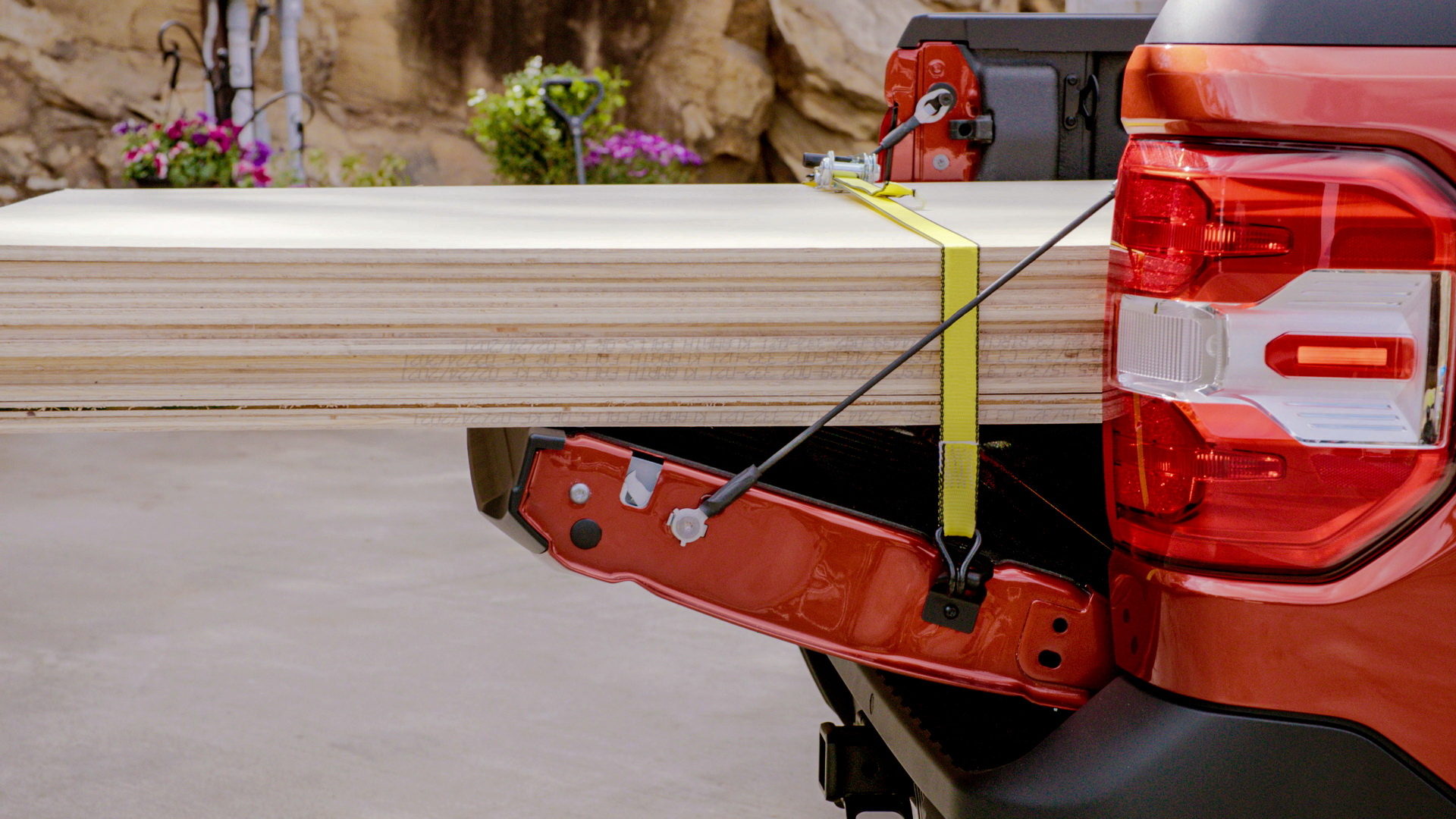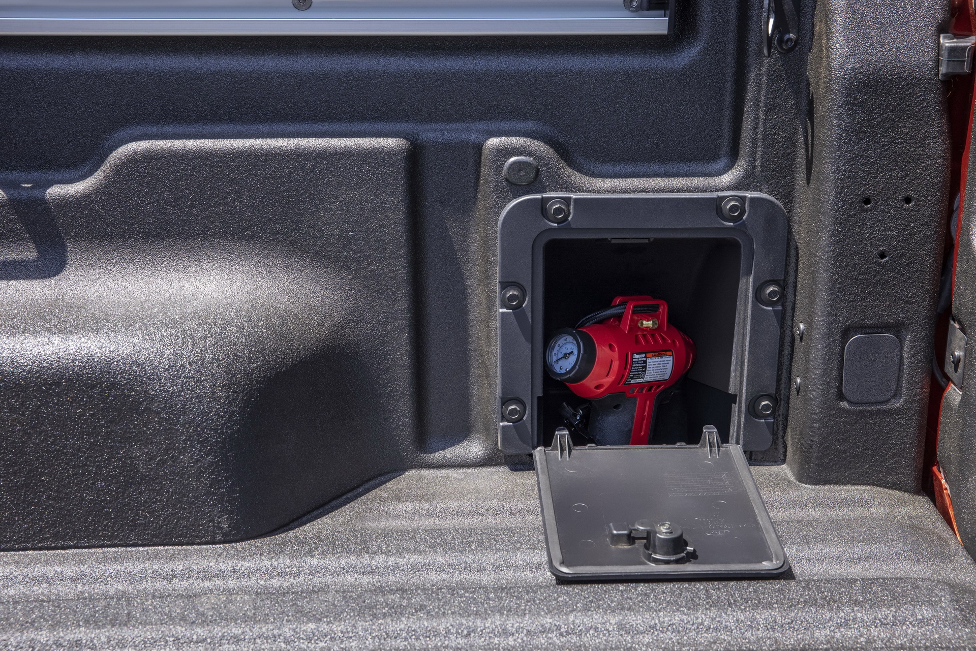 車輛貨斗尺寸為1,371mm,如果尾門打開則可達到1,828mm,尺寸似乎不大幹其中充滿了各種巧思。原廠稱之為Flexbed,負載區域周遭具有特殊的插槽,可藉由木板來分割物品擺放,貨斗邊還有多個D型扣,透過綁帶來固定物品,就連尾門上也有配置,在北美允許開貨斗載物情況下,就能輕鬆固定以防滑落。再來,貨斗後方有個隱藏儲存格,能放置小物品。儲存格的另外一邊則是一個110V插座,還有一個則安置於車內。