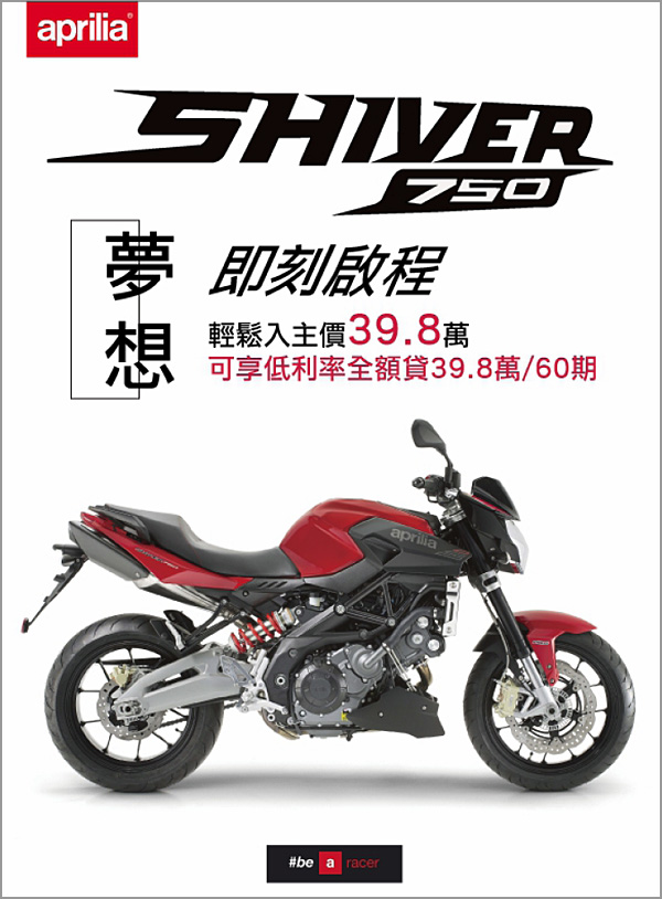 過去經驗告訴我們,歐系車售價大多凌駕於日系車款之上,而這次aprilia總代理跌破大家眼鏡,推出讓人驚嘆的圓夢專案!只需39.8萬元,即可擁有義大利品牌aprilia旗下的中量級性能街車 SHIVER 750。有興趣朋友可至台灣aprilia官網了解。