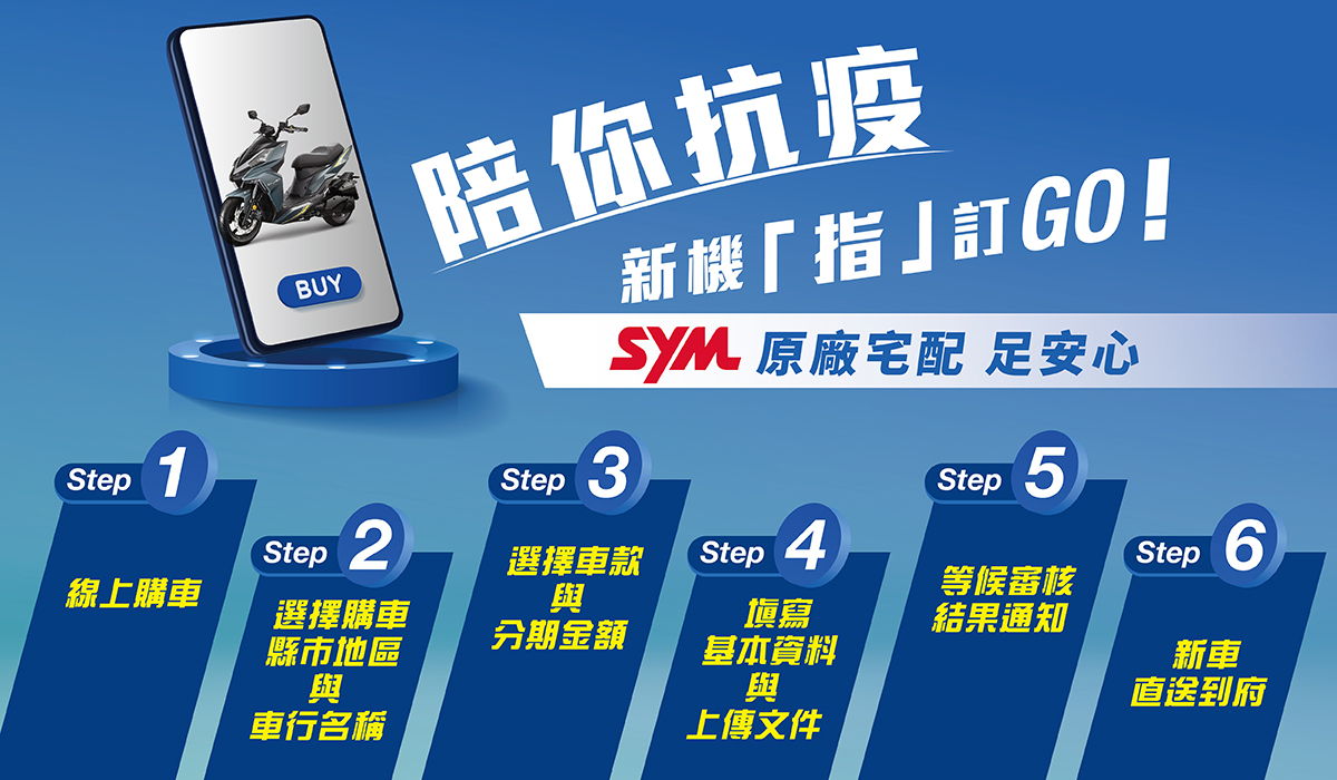 SYM線上購車服務,提供消費者在SYM官網賞車後,消費者可直接線上完成購車及分期手續辦理,並依照SYM線上購車網站選擇購車地區及服務車行,上傳基本資料及相關文件,即可完成愛車訂購與分期手續辦理,SYM更提供貼心的新車直送到府服務,讓消費者免去外出染疫的風險,輕鬆一指安心購新車!