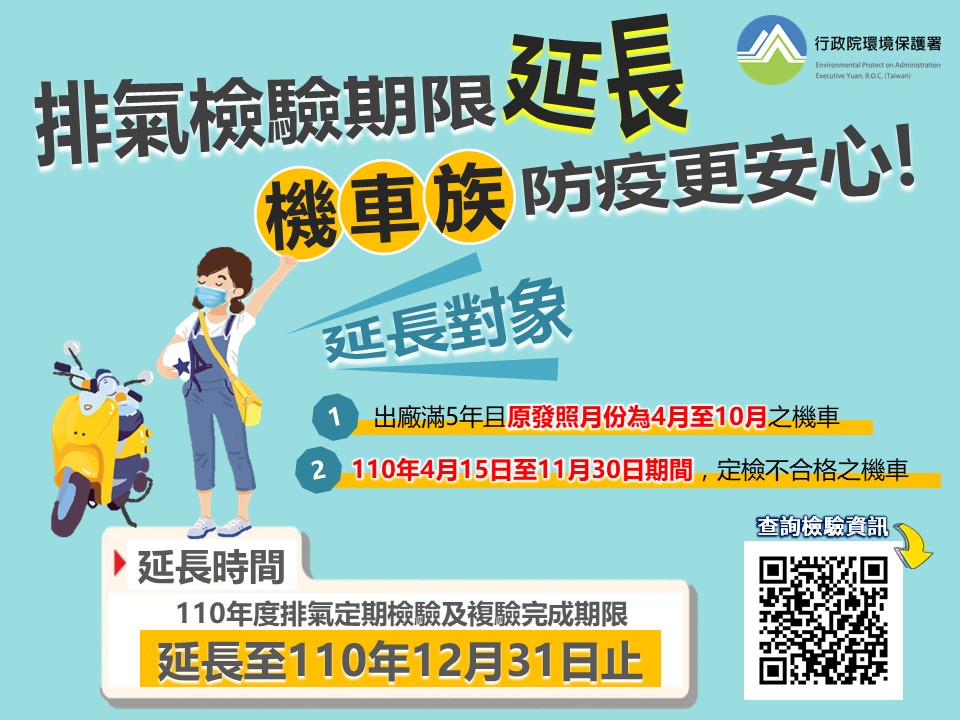 目前因應疫情最新規定只要是「設籍及出廠滿5年以上,且行車執照原發照月份為4月至10月份之機車,110年度實施排放空氣污染物定期檢驗期限,延長至110年12月31日止。」