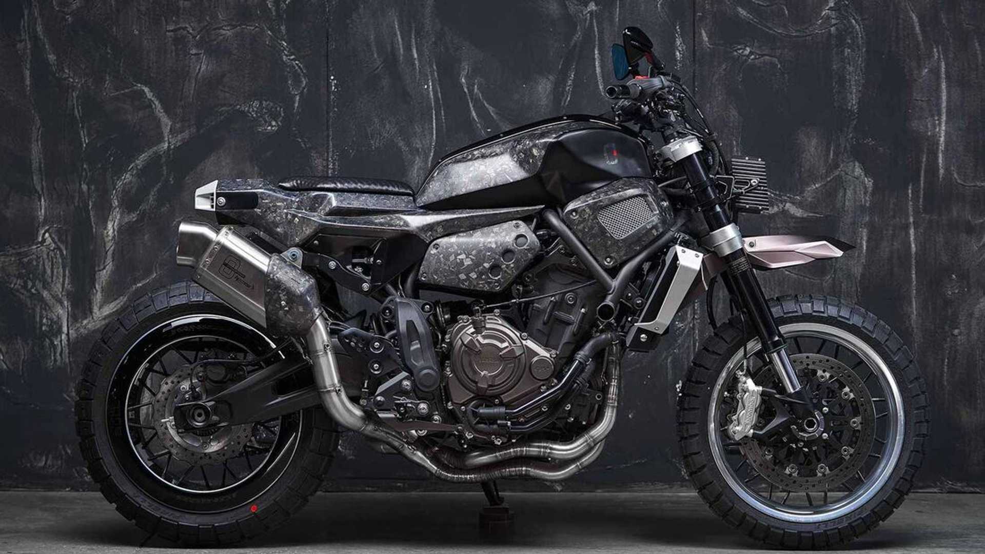 除了車身線條上的大幅修改之外,Officine GP Design也毫不手軟的將全車的車身鈑件換成極度前衛的鍛造碳纖維材質,有如水墨暈開一般的視覺效果,替這台XSR700 THe Bull帶來神似數位迷彩的科幻感。