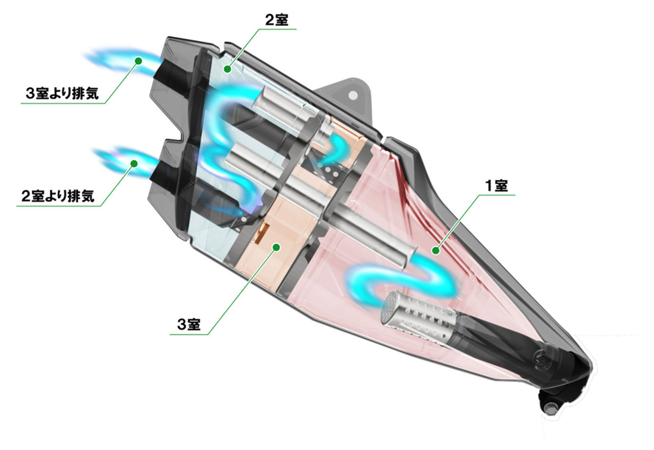 排氣管是CBR250RR設計的另一大重點,一台跑車沒有聲浪如同老虎沒了牙,少了靈魂,Honda為此也特別下了功夫,CBR250RR的尾管分為三個氣室,第三與第二氣室分別各有出口,在低轉速時廢氣會繞經第三氣室後排出,讓低速時有較好的扭力,聲音也較為低沉,而轉速拉高氣體流速上升,廢氣在第二室就會被排出,排氣更為順暢有利於高轉速動力延伸,聲音也會變得更為狂暴。