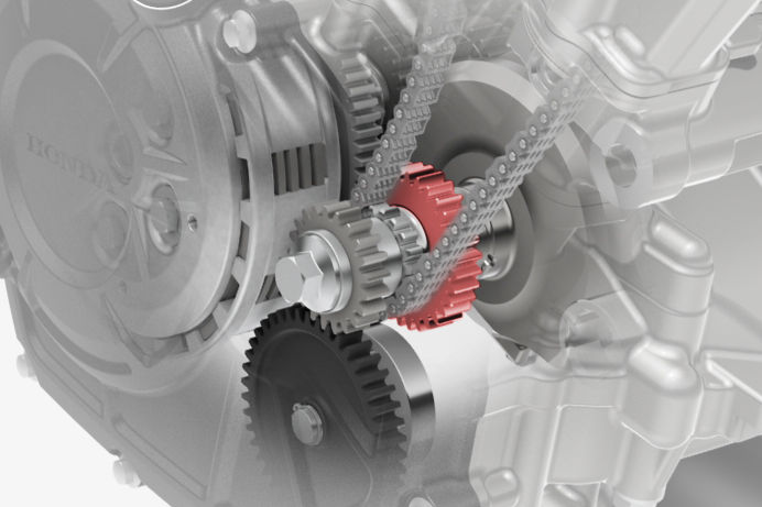 帶動機油泵的方式與以往設計不同,不用鍊條改用齒輪直接與曲軸嚙合,內鍊位置也做了調整,改由機油泵同軸帶動,這樣的設置讓離合器可以更靠近引擎核心,進一步減少引擎寬度,位置更動後,離合器推桿位置也連帶受到影響,從車輛右側離合器上方,改到了左側ACG三項發電機旁。