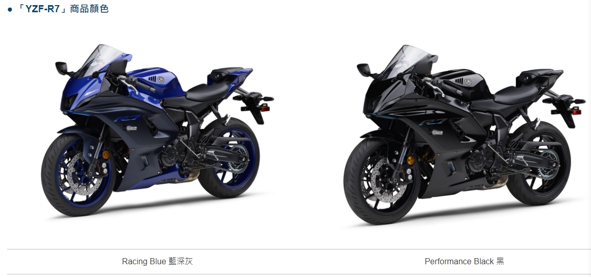 電控配備部分,YZF-R7和MT-07一樣除了ABS之外並沒有其餘的電控系統,在YZF-R7上唯一新增的就只有可額外選配的進檔快排功能;車色方面,本次台灣山葉引進的YZF-R7分別有「Racing Blue 藍深灰」、「Performance Black 黑」兩種顏色可供選擇。