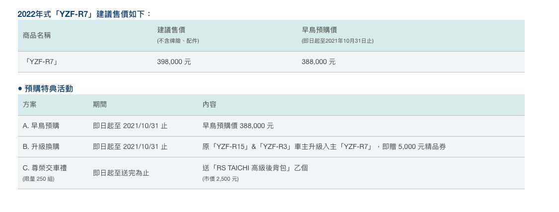 本次YAMAHA YZF-R7開出40萬有找的價格,在台灣目前的仿賽車市場上確實相當有競爭力,更運動、熱血的車輛設定肯定會對HONDA CBR650R等競爭對手帶來不小的壓力,喜歡的朋友可以趕緊前往YAMAHA的各地經銷商去訂車囉!