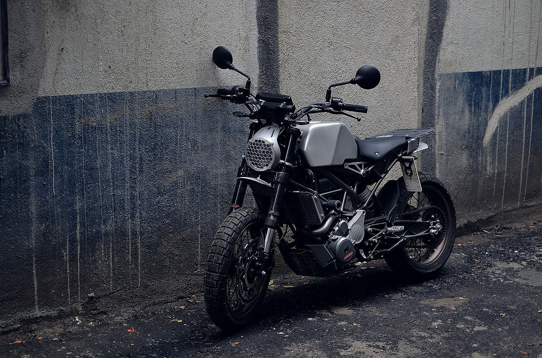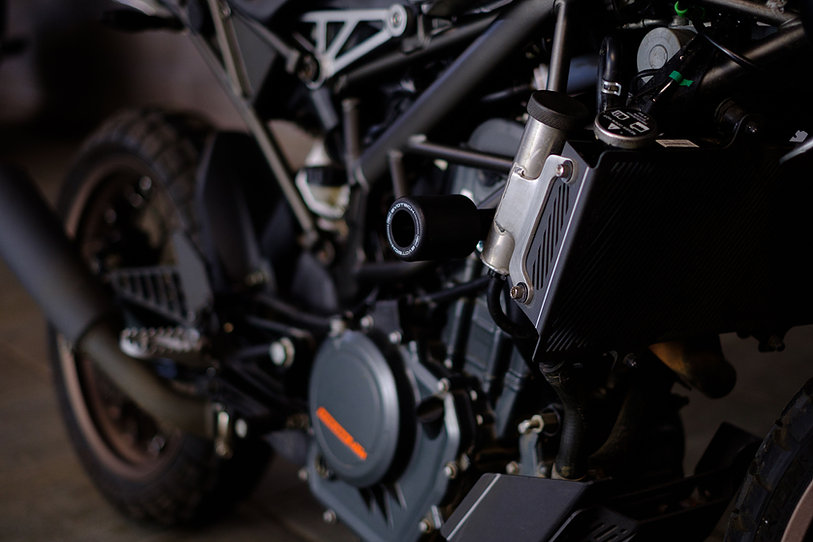 再將目光往下,古銅色的鋼絲框與大胎塊兩用胎讓這台車加強酷似Husqvarna的錯覺,最後低調的側置排氣管被漆上黑色烤漆,也讓這台390再加上一點神秘感受。