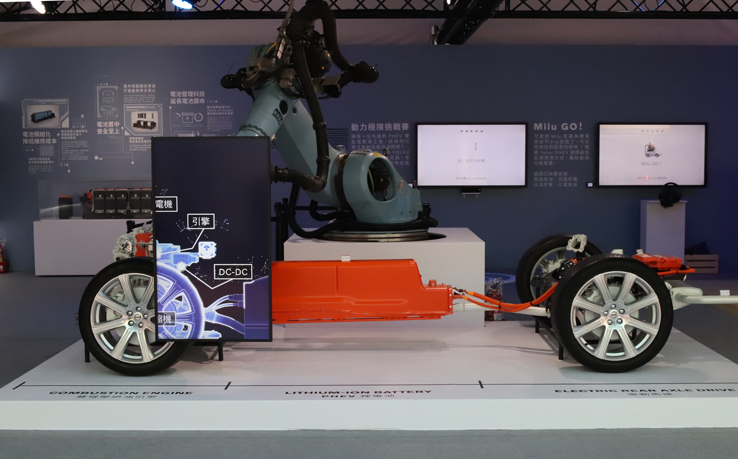 展場除以品牌旗艦休旅 XC90 T8 作為要角外,更特地從瑞典原廠空運來台 PHEV SPA 展示底盤,搭配 IA 機械手臂的掃描展演,讓參觀者更能全面了解 Volvo PHEV 的作動與優勢。