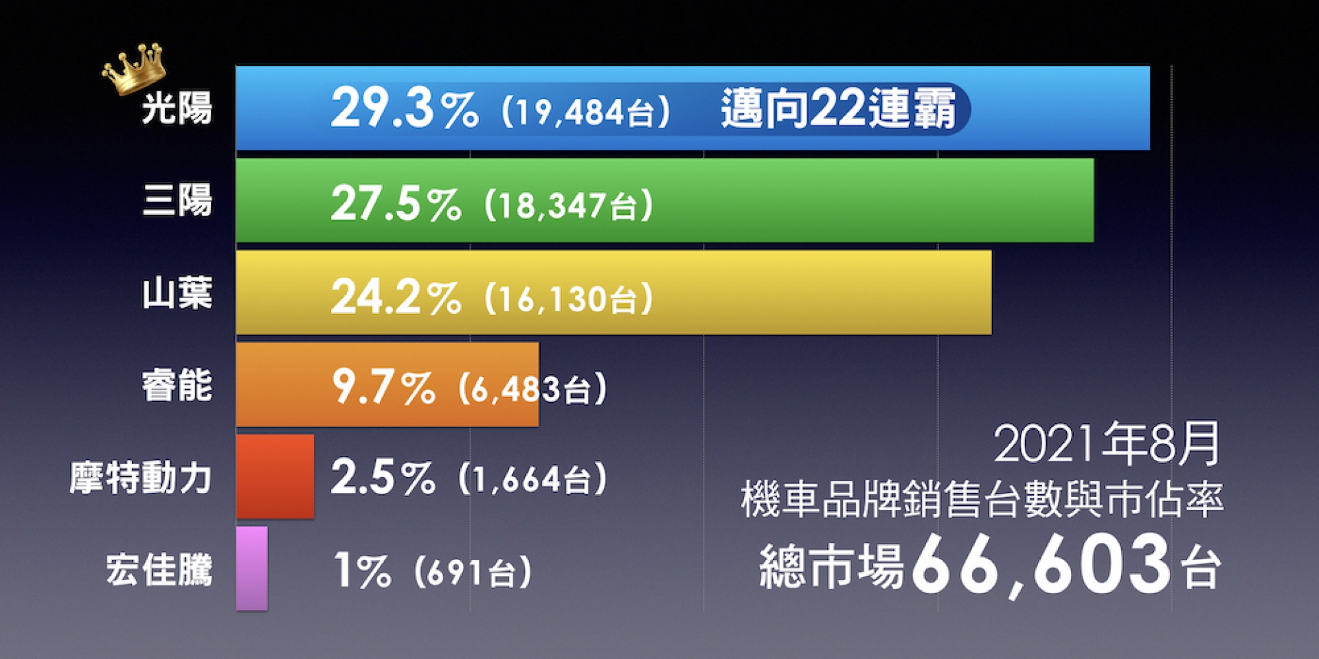 疫情微解封,台灣民眾報復性消費風潮也吹向機車市場,一掃五六月因疫情腰斬業績的市場陰霾,八月總市場銷量達66,603台接近疫情前今年單月最高峰3月70,753台。龍頭品牌KYMCO光陽工業仍以19,484台領牌數稱霸群雄,銷售量大贏一路纏鬥的SYM三陽18,347台,八月29.3%市佔穩坐龍頭,全年度以30.53%市佔居冠,是唯一車廠站上市佔率30%的機車業者。