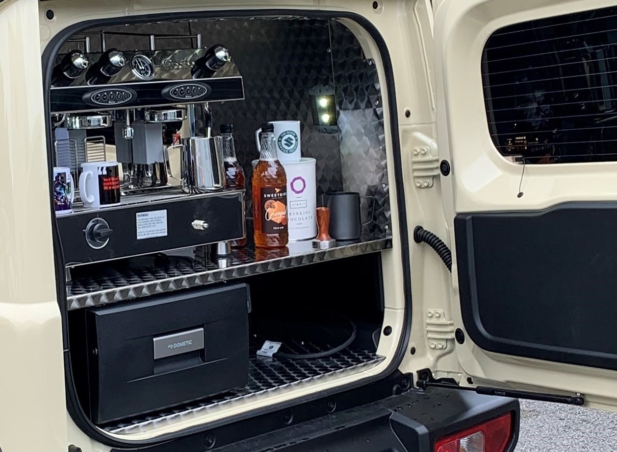 車輛改裝Suzuki是專家,但講到咖啡還是得請專業的來。因此他們找來當地知名店家Coffee Latino合作。在車上配置了57 升水箱和 3M 過濾水系統。同時車輛也強化供電系統,額外配置兩個大容量125A/H 12V電池,方便車上冰箱能將牛奶以-2 度冷藏。而咖啡機則是選用Fracino 製造的高規義式機,可以兩側同時供應香濃奶泡。